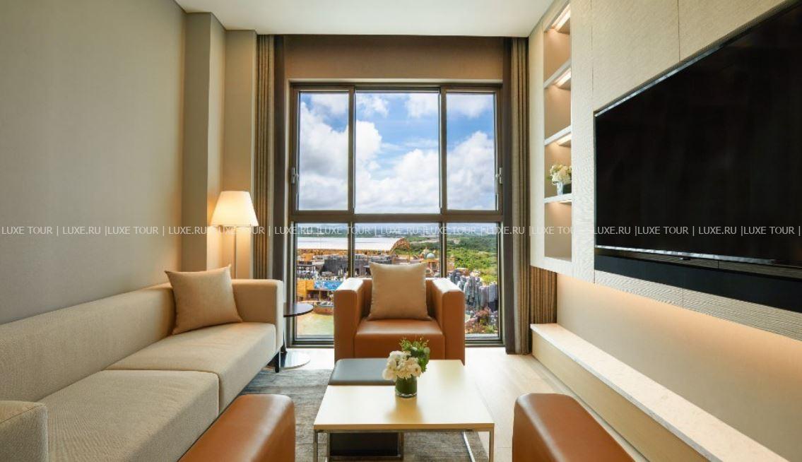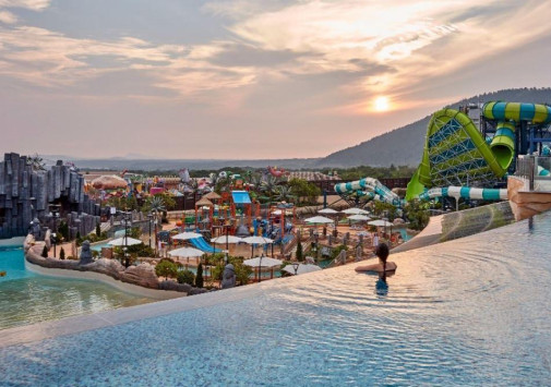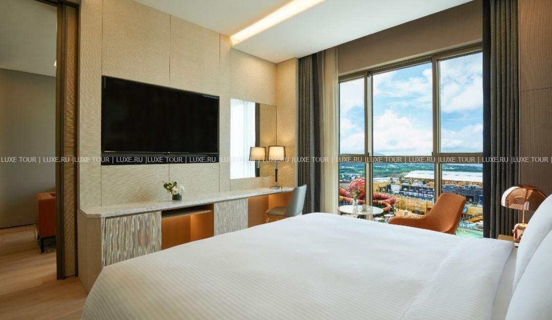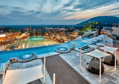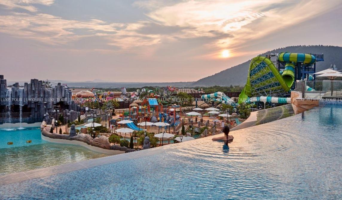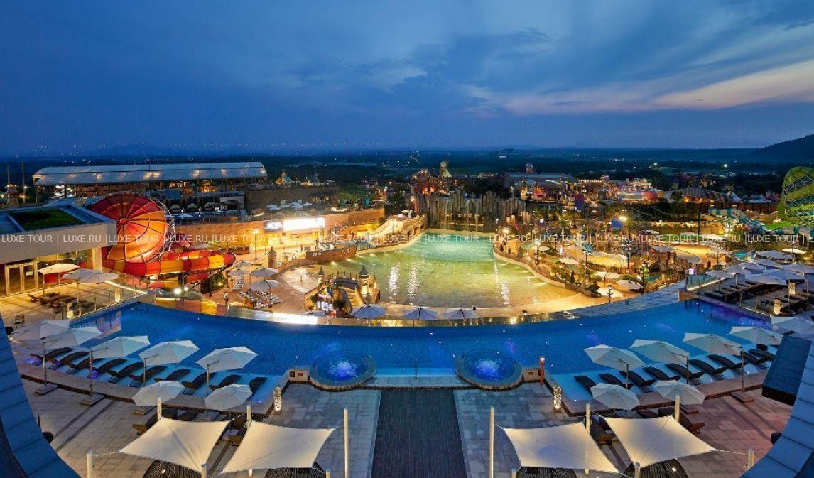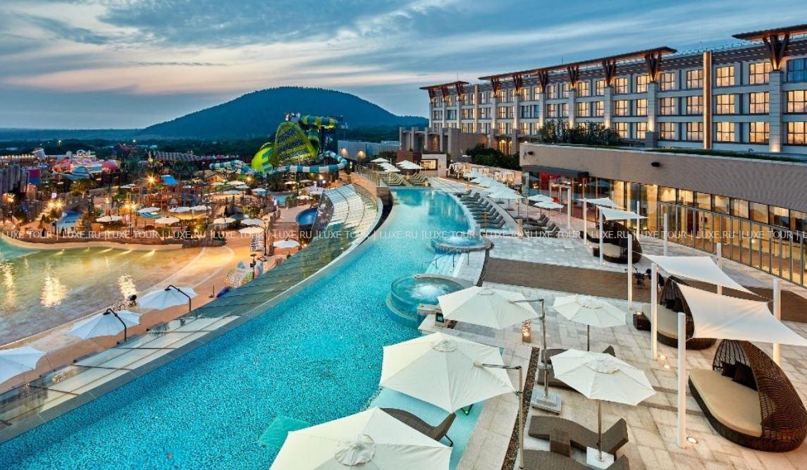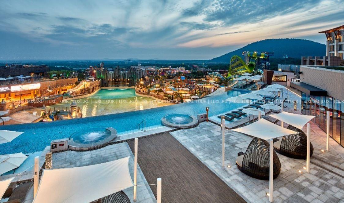 В отеле имеется открытый бассейн-инфинити Sky с подогревом и потрясающим панорамным видом на аквапарк и пейзажи Чеджу.