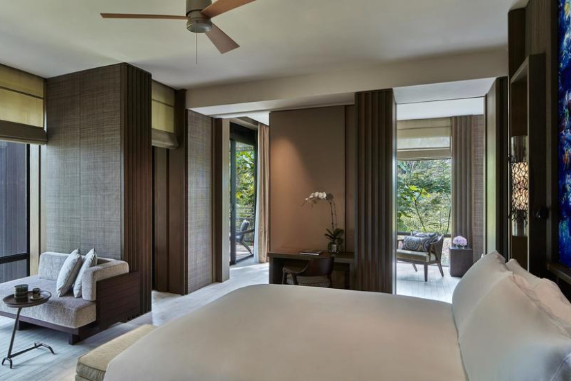- 650 м2. Роскошная вилла с видом на море и тропический лес, расположена в уединенной части отеля состоит из трех спален с кроватью king-size, гостиной, столовой, ванных комнат с ванной и душевой кабиной, гардеробной, просторной террасы с двумя бассейнами и зоной отдыха. Максимальное размещение – 6 взрослых + 2 ребенка.