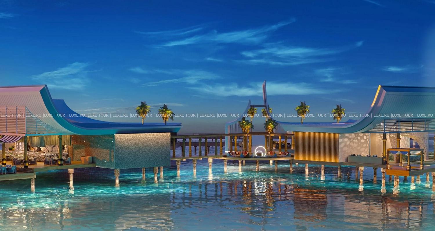 930 м2. Шикарная вилла с тремя спальнями, гостиной, столовой, кухней, ванными комнатами, террасой с 15-метровым бассейном, зонами отдыха, обеденной зоной и видом на океан. Виллы расположена на сваях над водой лагуны на острове Nowhere.