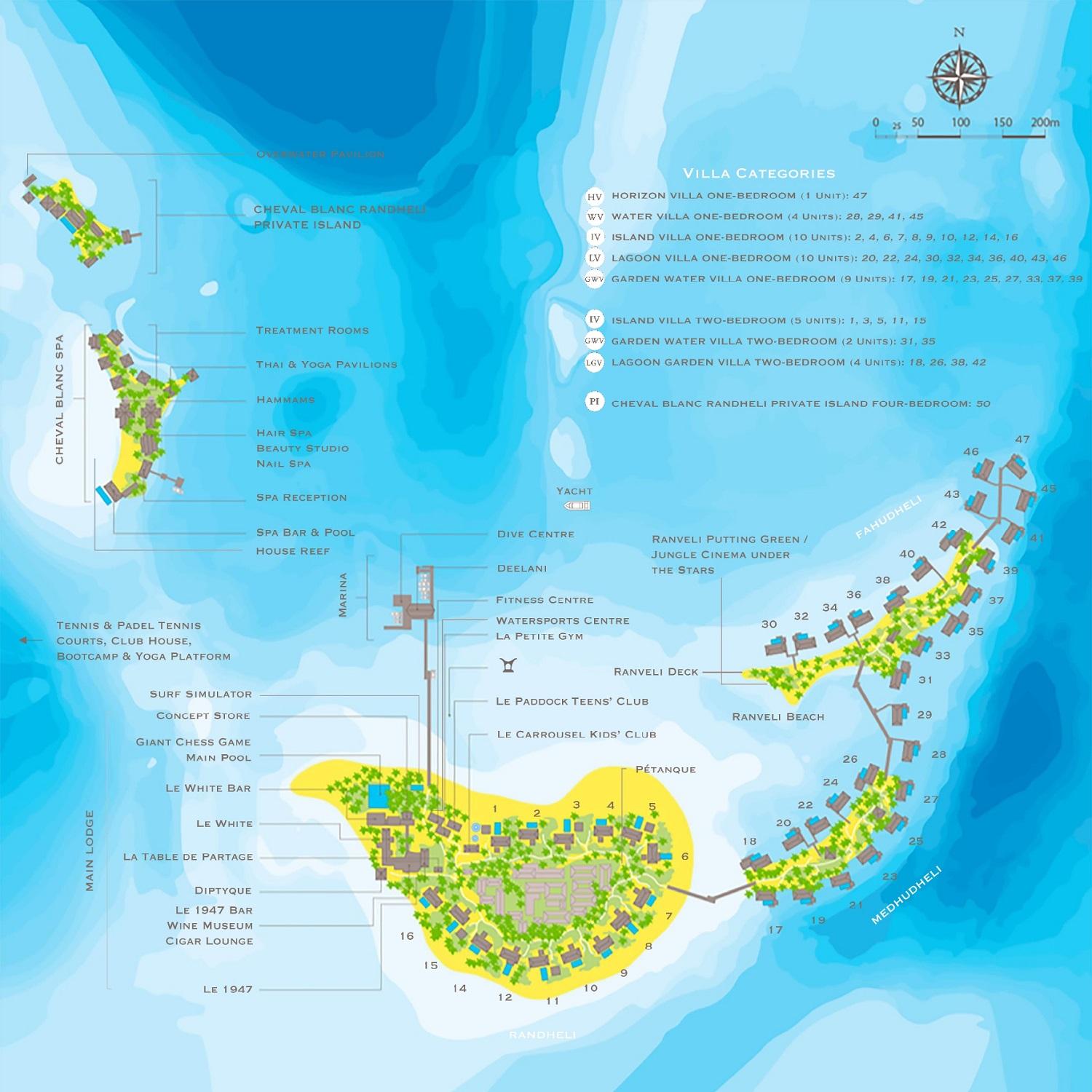 На отдельном острове, куда гостей доставляют на традиционной лодке-дни, находится роскошный комплекс Cheval Blanc Spa, в котором имеется: хаммам, парная, купель с холодной водой, спа-бутик, парикмахерский салон, крытые и открытые зоны отдыха, спа-бар, павильоны для йоги и тайского массажа, и 6 процедурных вилл, включая 4 одноместных и 2 виллы для пар. В центре предложен широкий спектр процедур и программ на основе азиатских и западных методик и с использованием натуральных продуктов и эксклюзивной косметики.