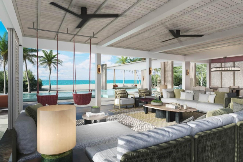 - 294 м2 + внешнее пространство 397 м2. Состоит из гостиной с обеденной зоной, трех спален (две с кроватью king-size, одна с twin) в ванными комнатами, террасы бассейном, душем на открытом воздухе, зоной отдыха и спуском в воду. С видом на закат или рассвет. Максимальное размещение - до 6 гостей.