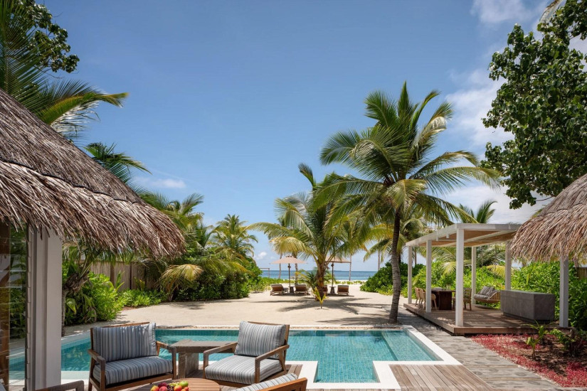 - 262 м2. Состоит из двух спален с кроватью king-size или двумя кроватями twin, гостиной с обеденной зоной, двух гардеробных, двух ванных комнат открытого плана с ванной, крытым душем и душем на открытом воздухе, просторной террасы с бассейном (19 м2), зоной отдыха, обеденной зоной, видом на океан и выходом к пляжу. Виллы расположены в саду у пляжа. Максимальное размещение – 4 взрослых.