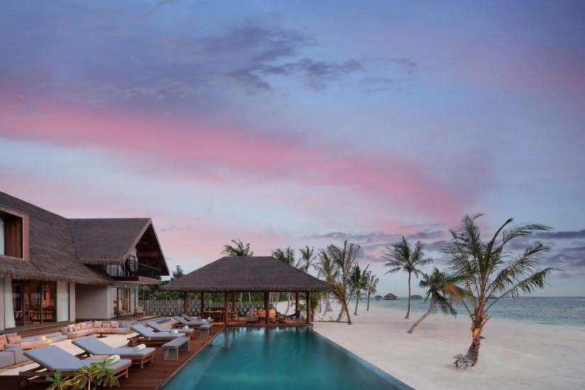 - 320 м2. Двухуровневая вилла состоит из трех спален с кроватью king-size или двумя кроватями twin, гостиной с обеденной зоной, трех ванных комнат (две – открытого плана с ванной, крытым душем и душем на открытом воздухе, одна – с душем), гостевой туалетной комнаты, балкона, просторной террасы с бассейном (64 м2), зоной отдыха, павильоном с баром, обеденной и гостиной зонами, видом на океан и выходом к пляжу. Виллы расположены в саду у пляжа. Максимальное размещение – 6 взрослых.