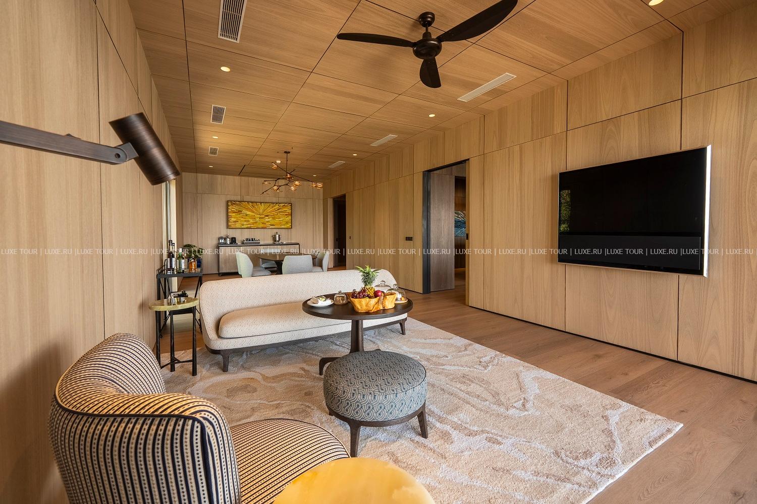 - 531 м2. Шикарная двухуровневая вилла состоит из двух спален (с кроватью king-size и двумя кроватями queen), гостиной, обеденной зоны, мини-кухни, двух гардеробных, двух ванных комнат, душей на открытом воздухе, балкона, террасы с большим бассейном, зонами отдыха, обеденными зонами, выходом к пляжу и видом на океан. Вилла расположена в уединенном уголке в саду у пляжа. Гостям виллы предоставляется VIP-сервис. Максимальное размещение – 4 взрослых + 2 ребенка.
