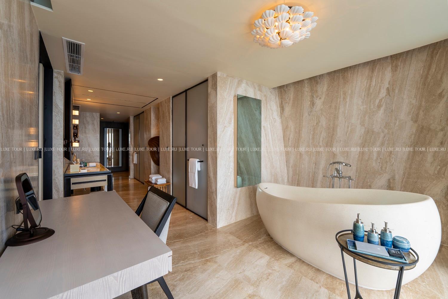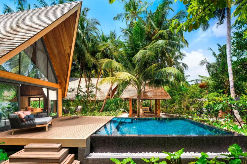 - 140 м2. Состоит из спальни с кроватью king-size и зоной отдыха с диваном, гардеробной, ванной комнаты открытого плана с ванной и душем, душа на открытом воздухе, террасы с бассейном (15 м2), зоной отдыха, шезлонгами, выходом к пляжу и видом на сад и океан. Виллы расположены в саду у пляжа. Максимальное размещение – 2 взрослых + 1 ребенок