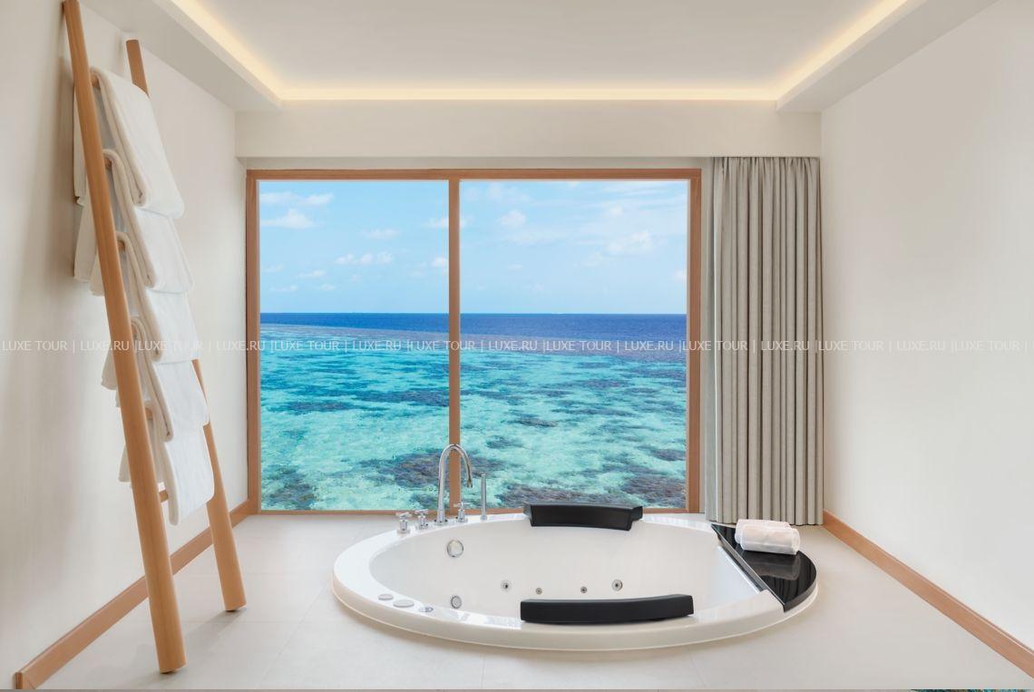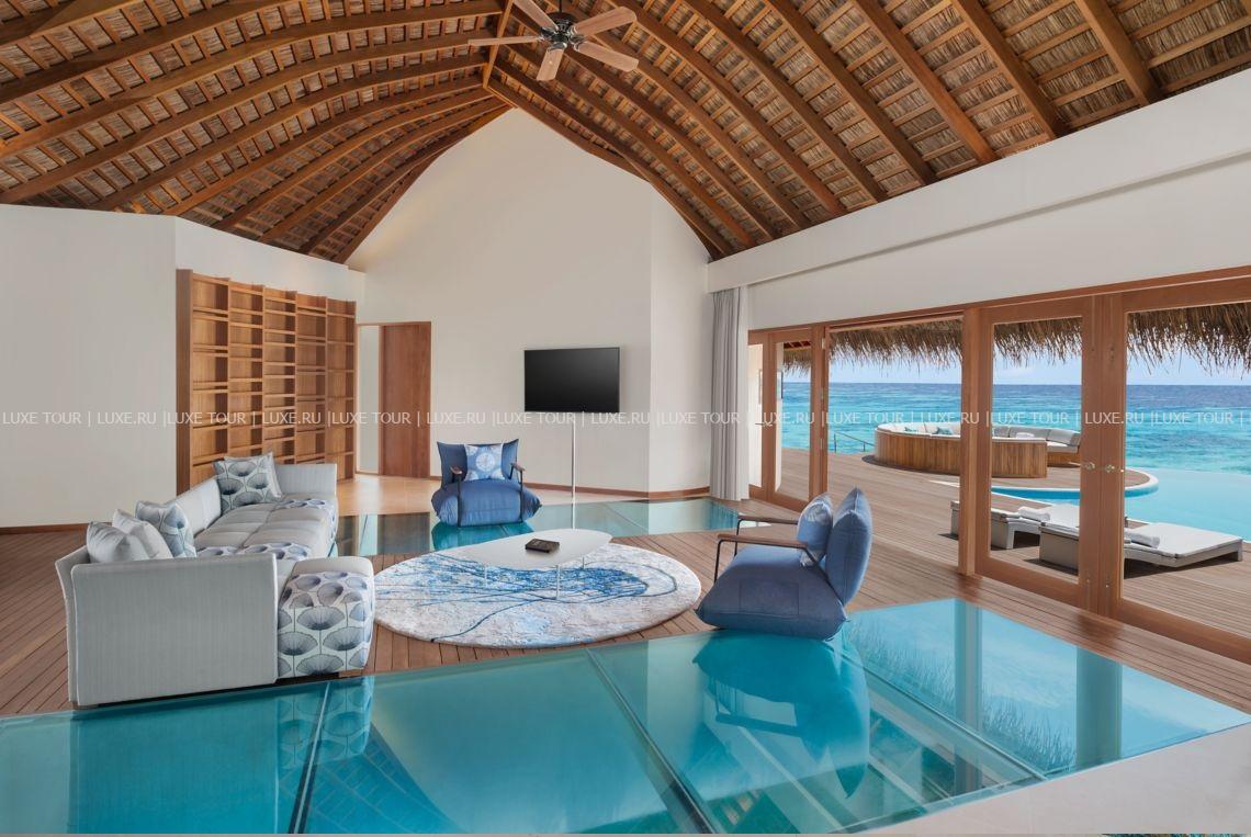 323 м2. Состоит из двух спален (с кроватью king-size и двумя кроватями queen), гостиной со стеклянными панелями в полу, обеденной зоны, двух ванных комнат с ванной и душем, просторной террасы с бассейном, зонами отдыха, гамаком над водой, спуском в воду и видом на океан. Виллы расположены над водой. Максимальное размещение – 4 человека.