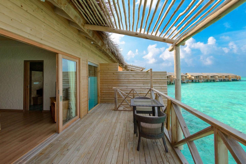 - 55 м2. Состоит из спальни с кроватью king-size и зоной отдыха, ванной комнаты с ливневым душем, террасы с зоной отдыха, спуском в воду и видом на лагуну и закат. Виллы расположены на сваях в лагуне.