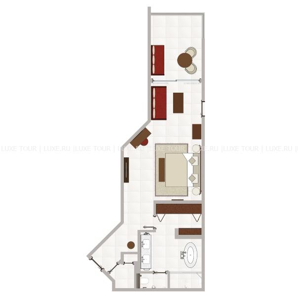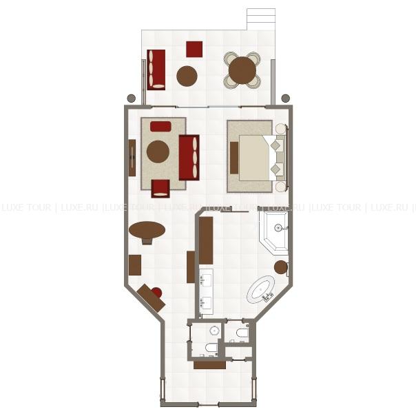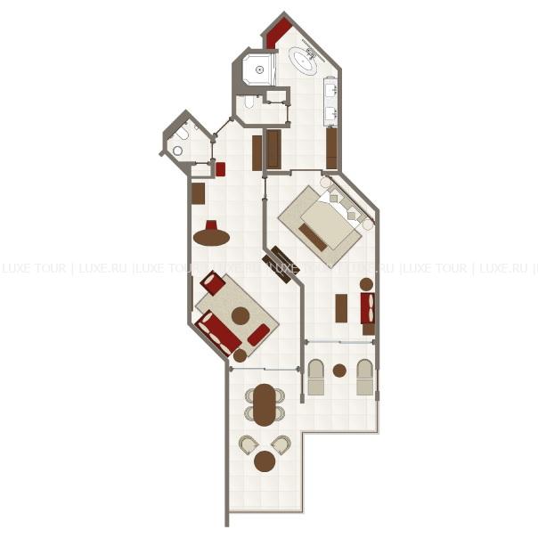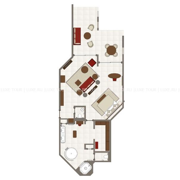 105 м2. Состоит из спальни, гостиной зоны, гардеробной, ванной комнаты, меблированной террасы с обеденной зоной и видом на океан. Максимальное размещение – 2 взрослых + 2 ребенка.