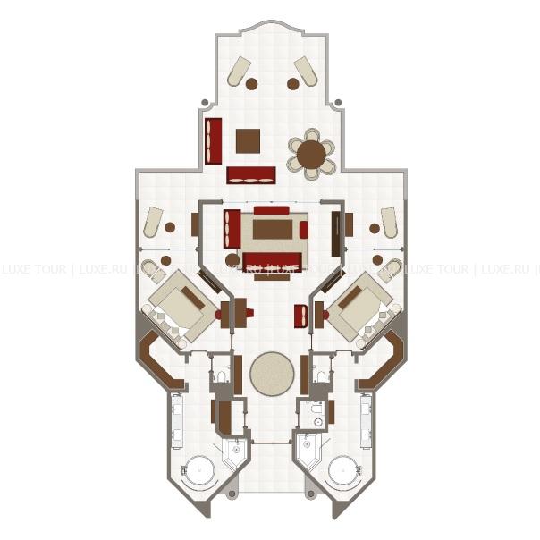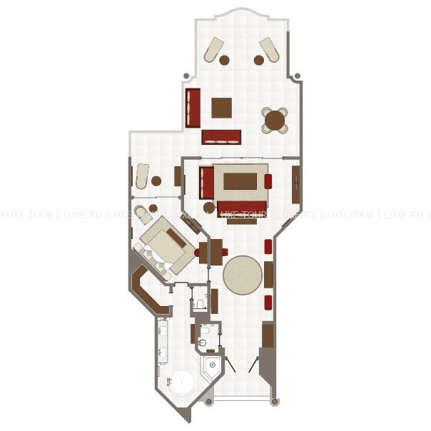260 м2. Состоит из двух спален, гостиной с обеденной зоной, гардеробных, двух ванных комнат, просторной меблированной террасы с обеденной зоной и видом на океан. Максимальное размещение – 4 человека.