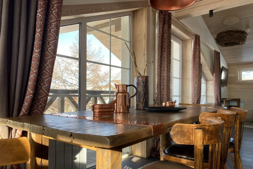 - 50 м2. Элегантный номер с индивидуальным дизайном состоит из трех спален (две с двуспальной кроватью, и одна – с односпальной), гостиной и обеденной зон, кухни, ванной комнаты с душем, дополнительной туалетной комнаты, балкона с видом на Байкал. Номера расположены на 2 этаже. Максимальное размещение – 6 человек.