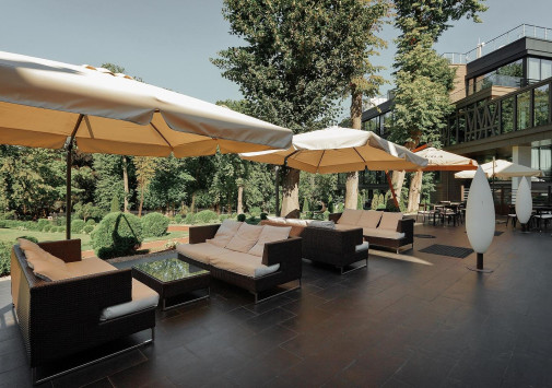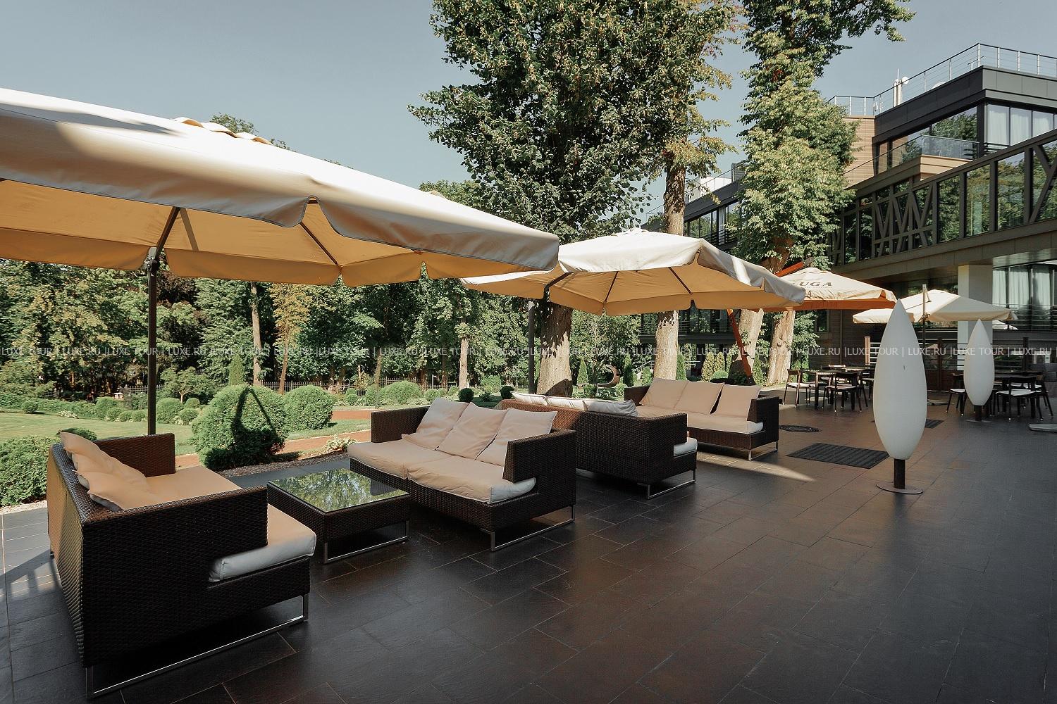 - Летняя терраса с видом на старинный парк – идеальное место для отдыха за напитком.