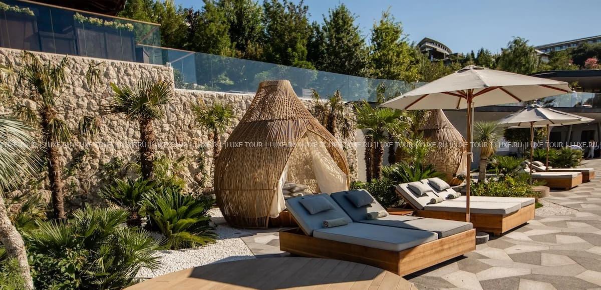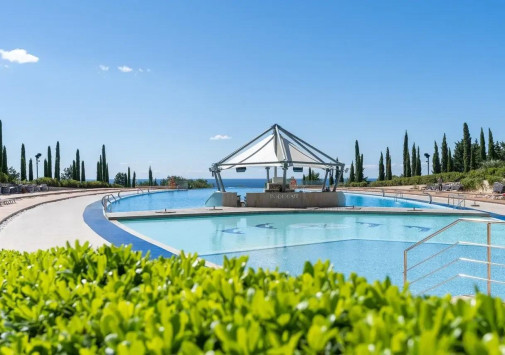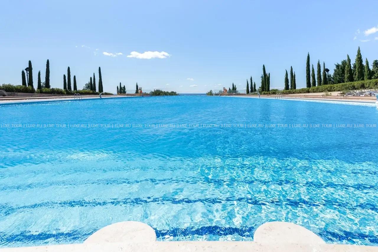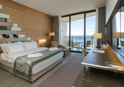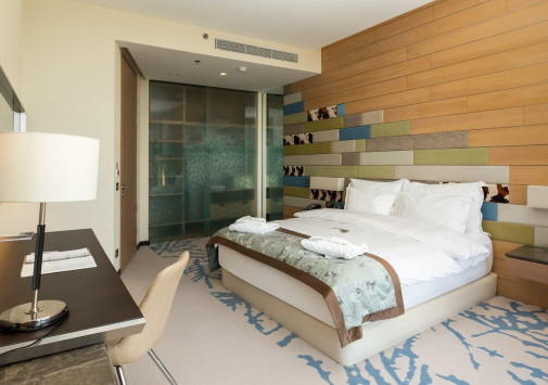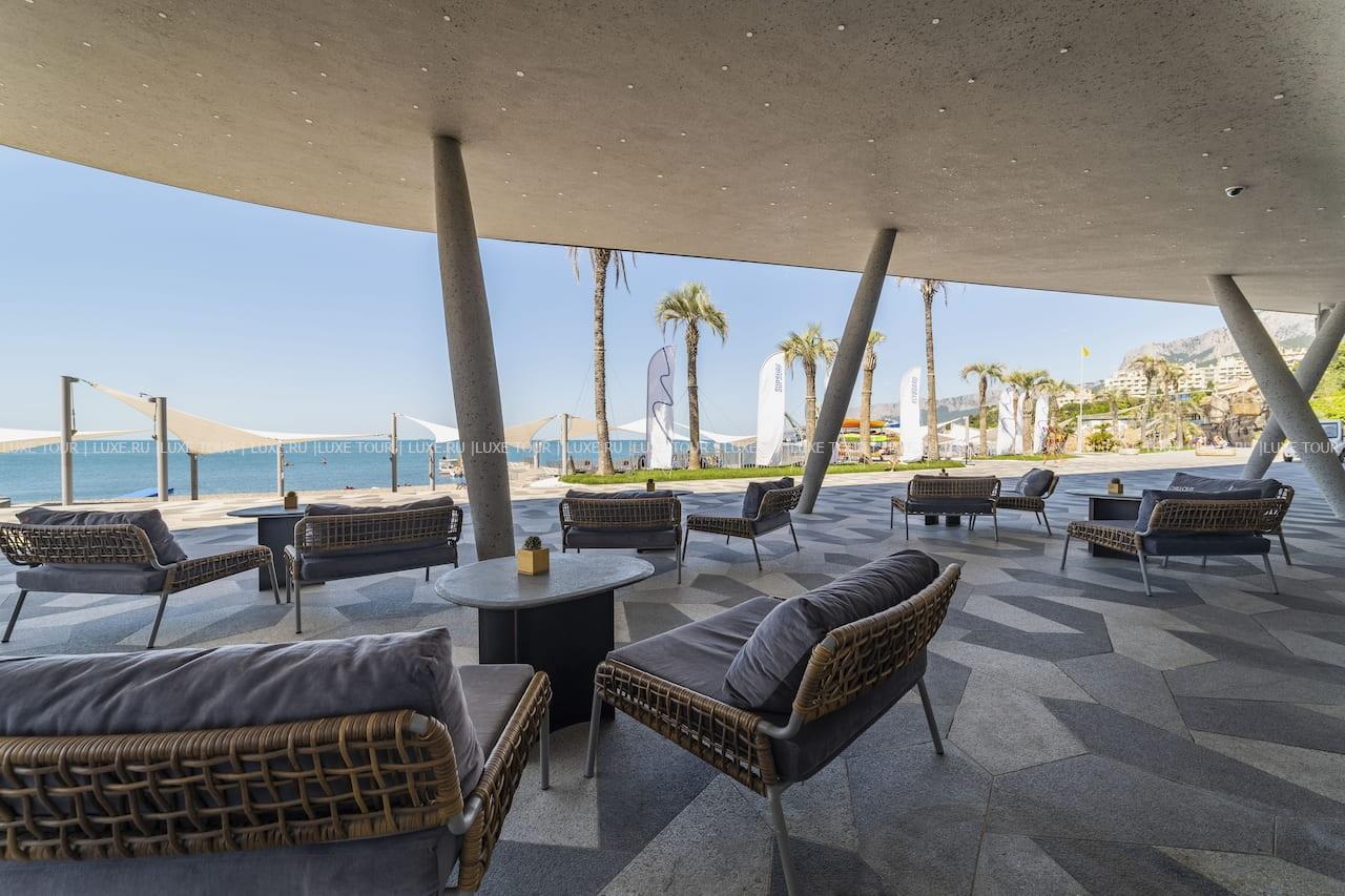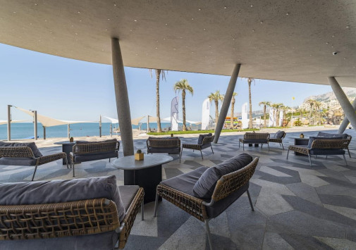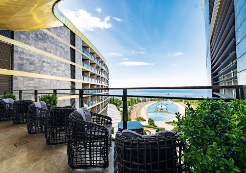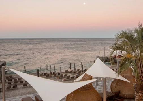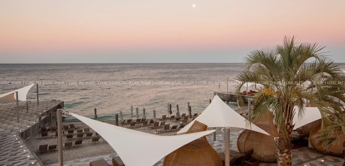 Отель располагает 300-метровым оборудованным галечным пляжем с барами и ресторанами, фитнес-зоной на открытом воздухе и зонами отдыха, включая детскую зону с пиратским кораблем и подогреваемым бассейном с морской водой. Пляж находится в 5 минутах ходьбы от отеля, также можно добраться на электромобиле, а спуск на пляж оборудован эскалатором.