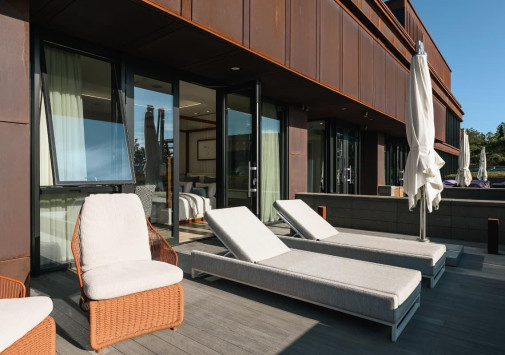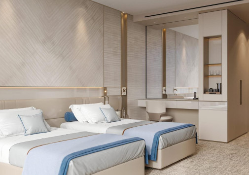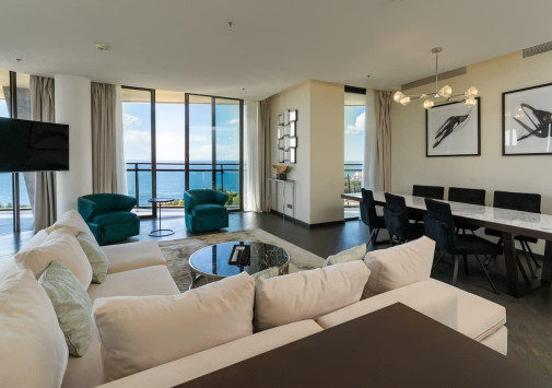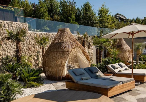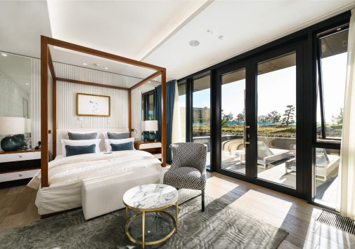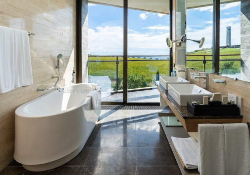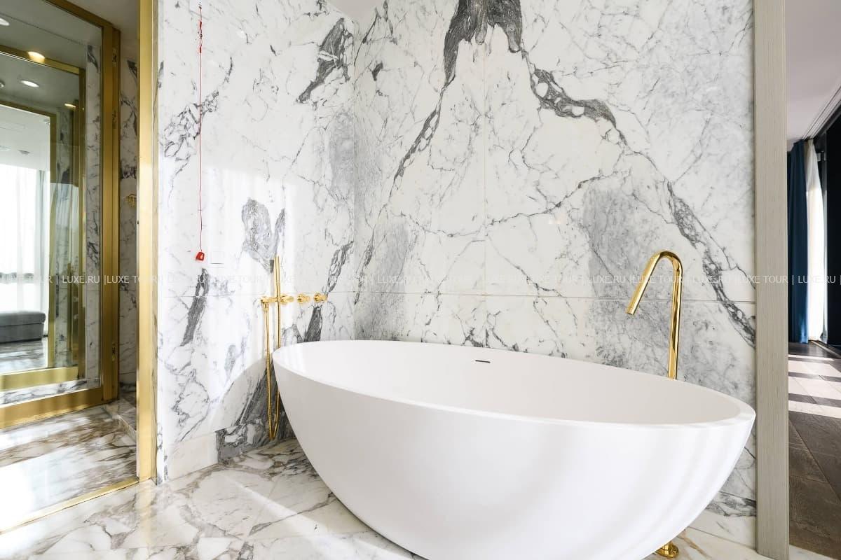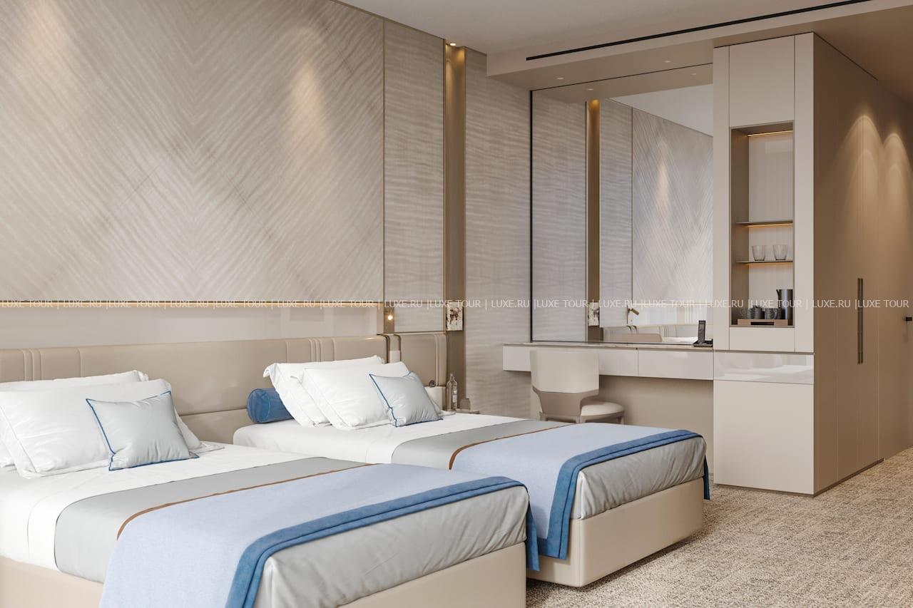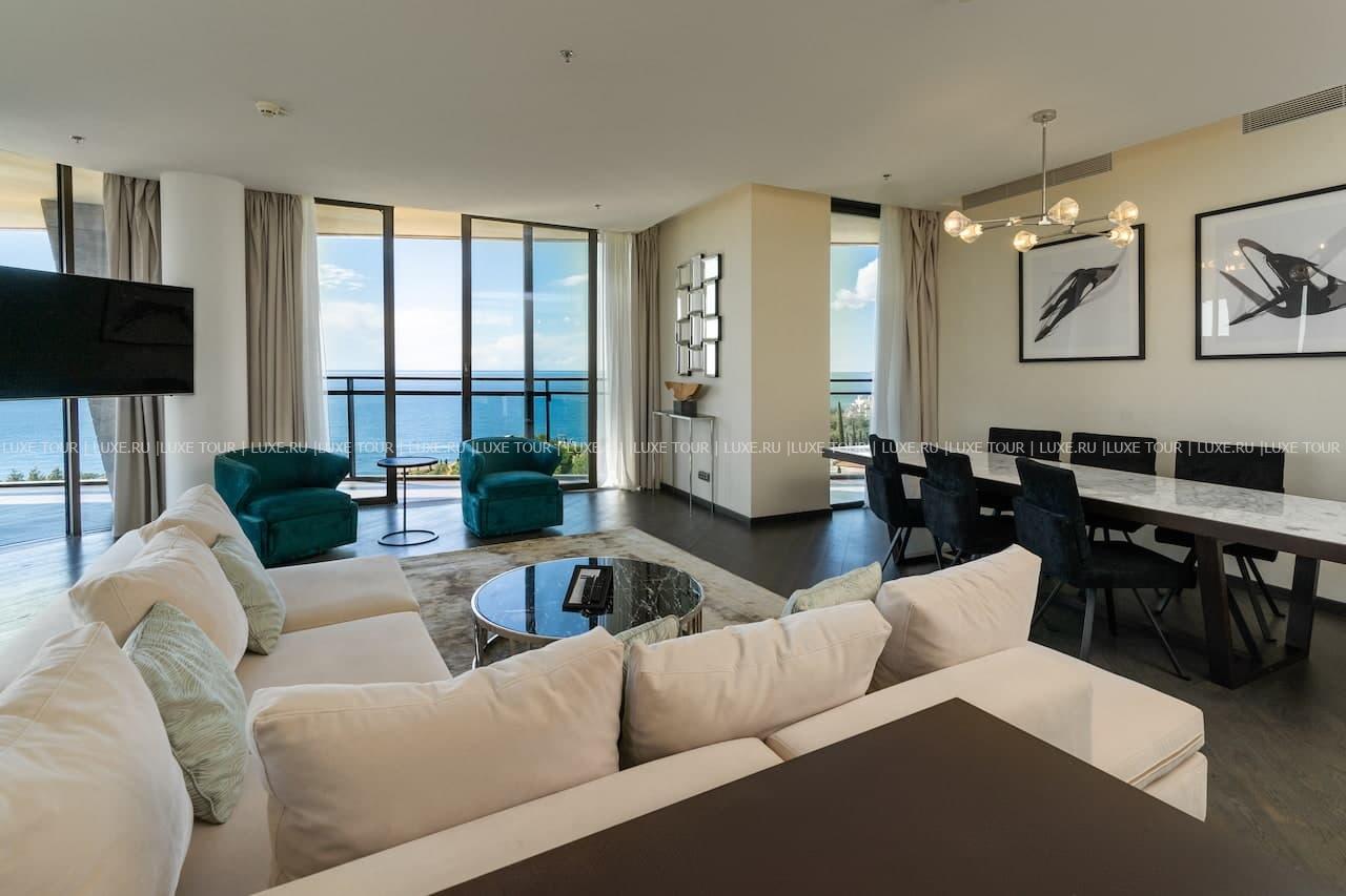 Отель располагает 300-метровым оборудованным галечным пляжем с барами и ресторанами, фитнес-зоной на открытом воздухе и зонами отдыха, включая детскую зону с пиратским кораблем и подогреваемым бассейном с морской водой. Пляж находится в 5 минутах ходьбы от отеля, также можно добраться на электромобиле, а спуск на пляж оборудован эскалатором.
