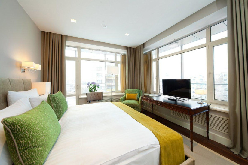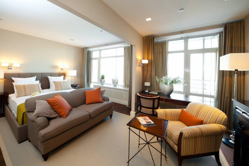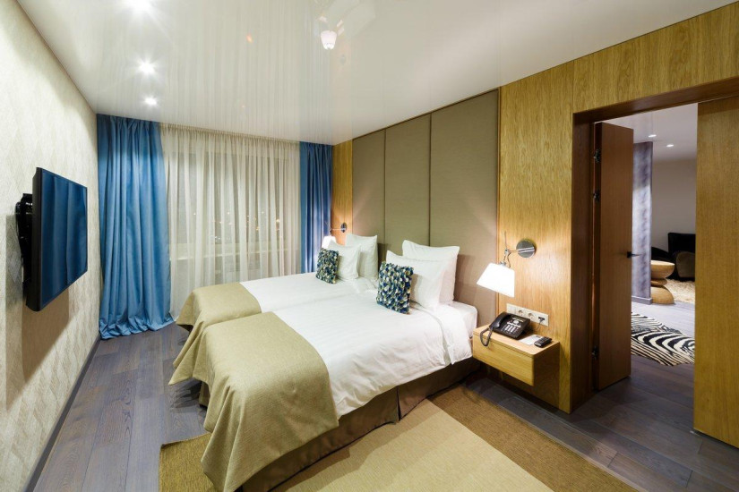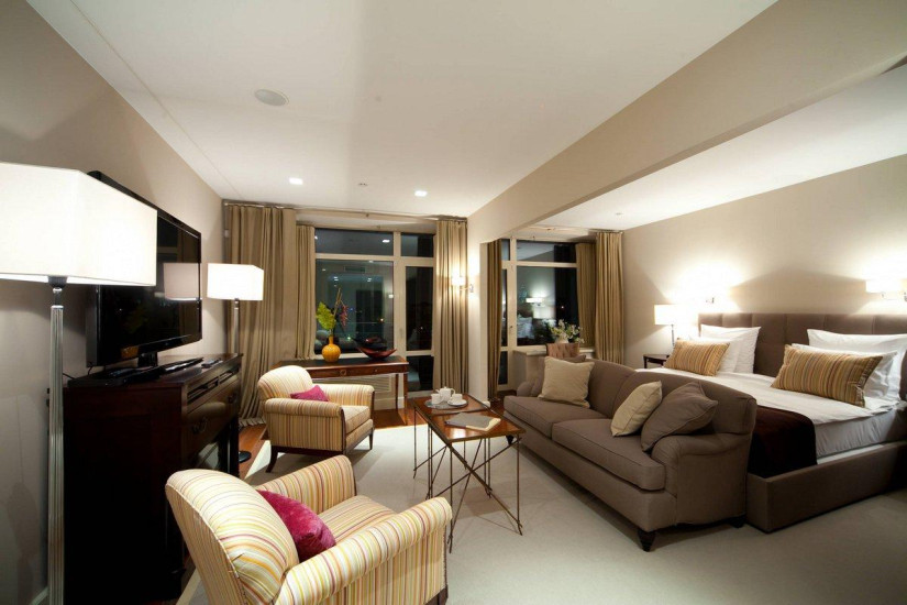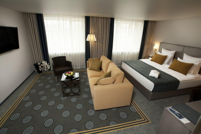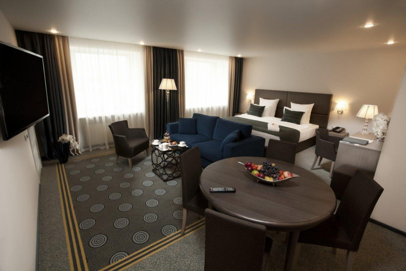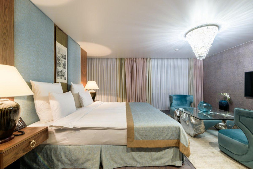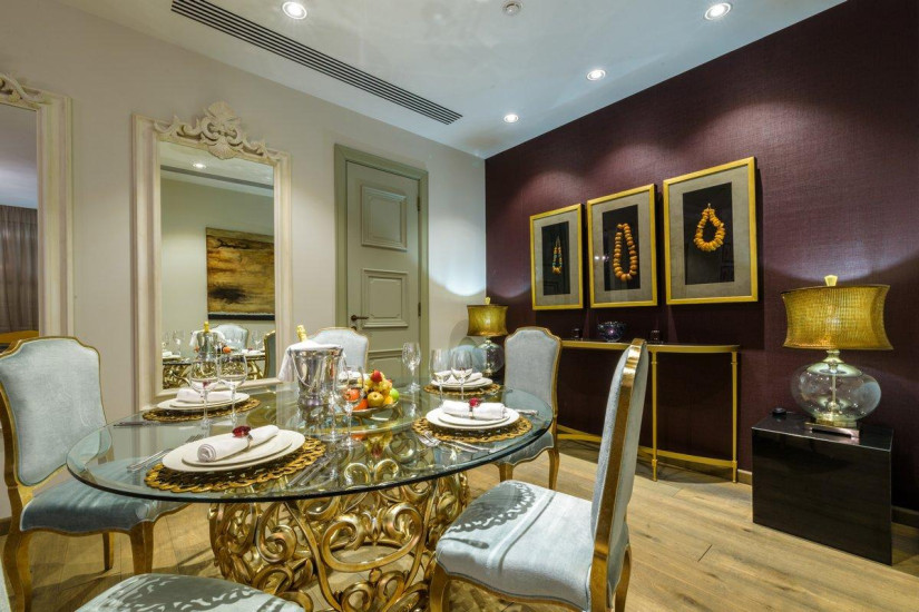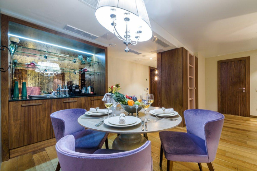 - 130 м2. Номер в стиле фьюжн в сдержанных тонах состоит из спальни с большой кроватью king и письменным столом с принадлежностями, гостиной, вместительной столовой зоной на 6 человек, полностью оборудованной кухни с варочной панелью, духовым шкафом, посудомоечной машиной, кофе-машиной, гардеробной, двух ванных комнат (основной - с душевой кабиной и ванной, предметами индивидуального пользования премиум-класса и гостевой ванной комнаты).