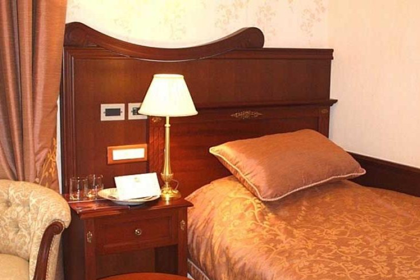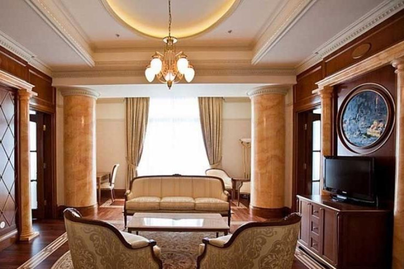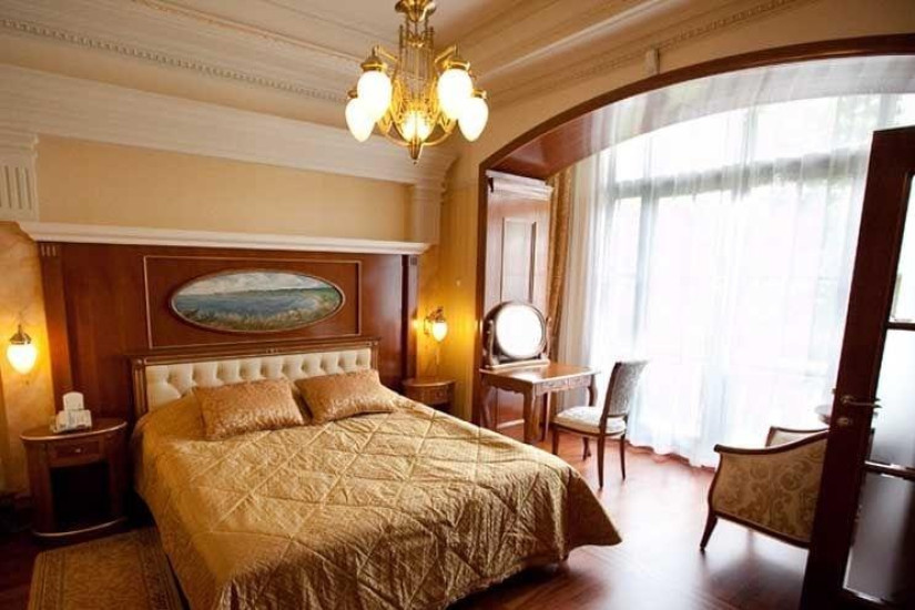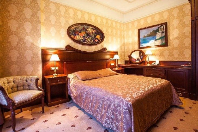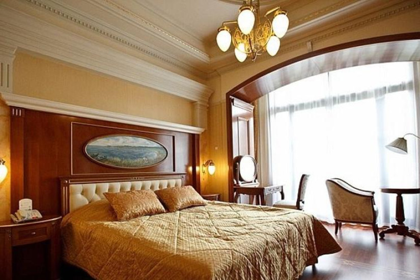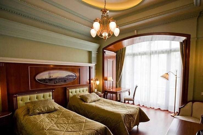 - 90-100 м2. Состоит из двух спальных комнат с большой двуспальной кроватью king и двумя кроватями twin, гостиной, двух ванных комнат, оборудованных душевыми кабинами и ванной, небольшой кухни. Номер выполнен в с классическом итальянском стиле эпохи раннего Ренессанса. Имеет вид на море.