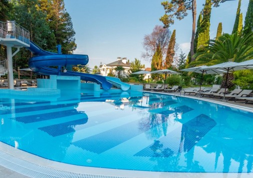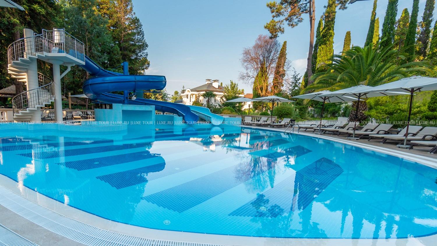 К услугам гостей приватный открытый бассейн с подогревом в зоне вилл, а также открытый детский бассейн «Корабль», открытый панорамный бассейн с видом на море и детский бассейн, расположенные на пляже, крытый подогреваемый спортивный 25-метровый бассейн с морской водой, анимационный бассейн с морской водой, и крытый «Водный городок» с горками и водными аттракционами.