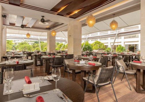 • Ресторан Grand Savoy с открытой террасой и видом на тропический сад предлагает «шведский стол» с разнообразием блюд интернациональной и креольской кухни, а также тематические ужины, представляющие кухню разных стран.