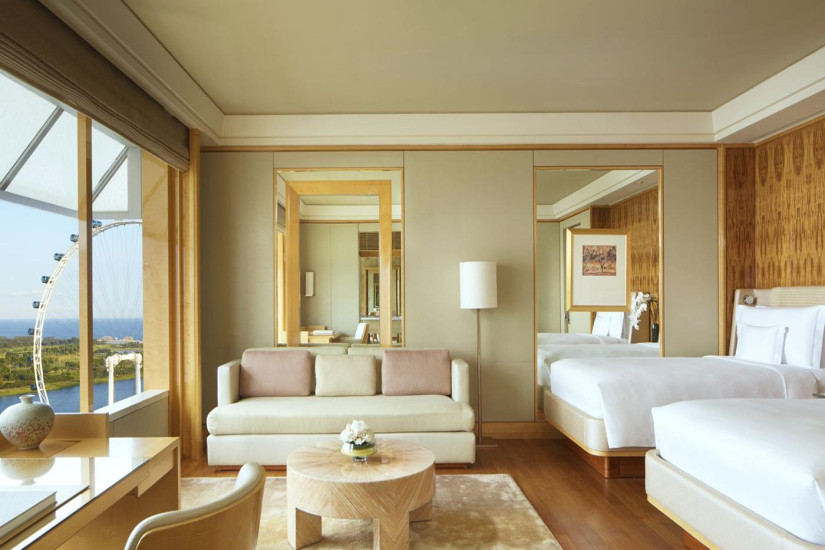 - 51 м2. Состоит из спальни с кроватью king-size или двумя кроватями twin, рабочей зоны и зоны отдыха с диваном, ванной комнаты с ванной, душем и окнами, гардеробной. Вид на Марина-Бэй. Номера располагаются с 4 по 22 этаж. Максимальное размещение – 3 взрослых.