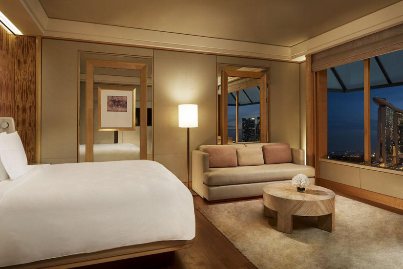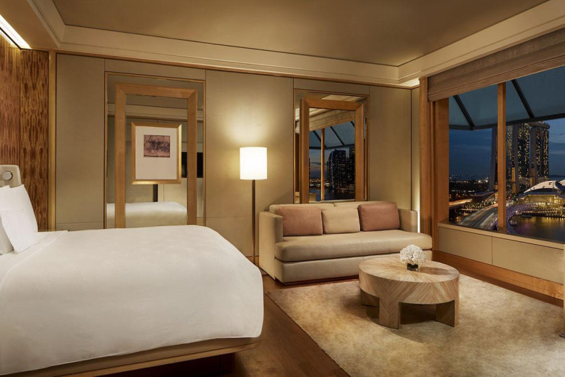 - 51 м2. Состоит из спальни с кроватью king-size, рабочей зоны и зоны отдыха с диваном, ванной комнаты с ванной, душем и окнами, гардеробной. Панорамный вид на Марина-Бэй. Номера располагаются на верхних этажах. Максимальное размещение – 3 взрослых.