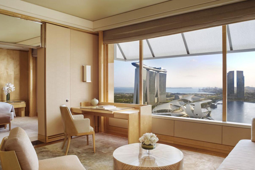 - 102 м2. Состоит из спальни с кроватью king-size или двумя кроватями twin, гостиной с зоной отдыха, обеденной и рабочей зонами, ванной комнаты с ванной, душем и окнами, гостевой ванной комнаты, гардеробной. Панорамный вид на Марина-Бэй. Номера располагаются с 24 по 32 этаж. Максимальное размещение – 3 взрослых. Гостям номера предоставляются услуги The Ritz-Carlton Club и доступ в клубную гостиную.