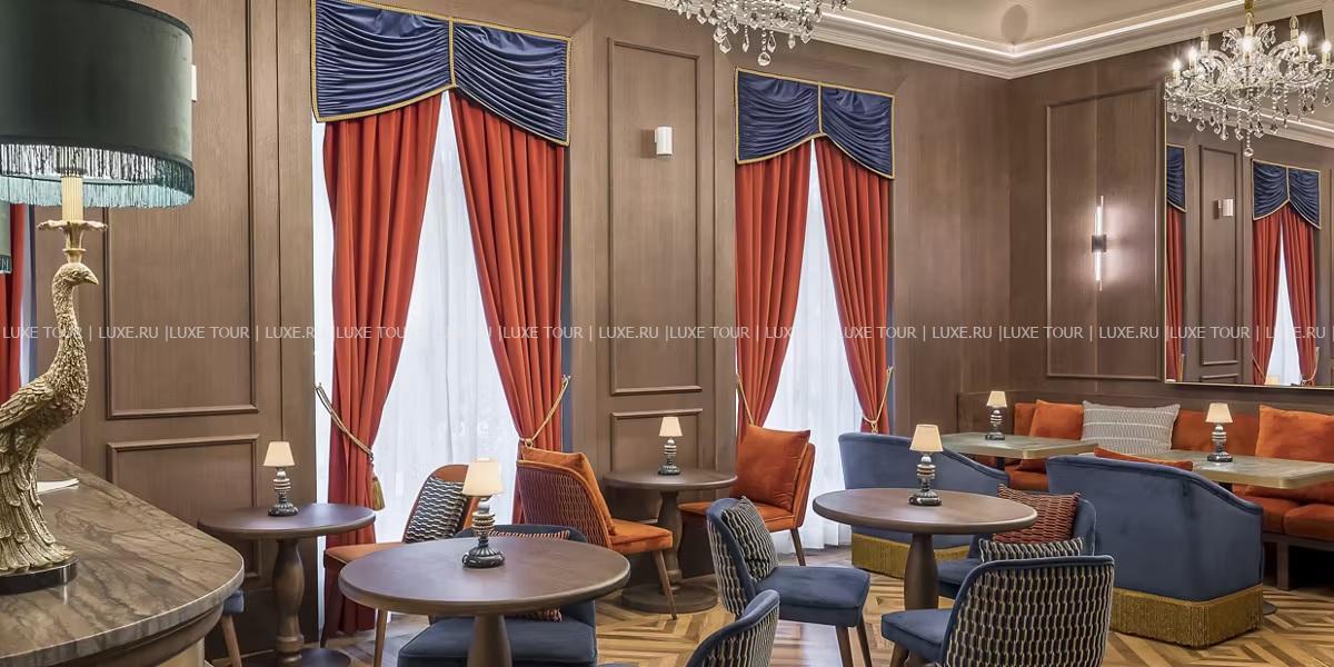 - В стильном Grand Café подают легкие закуски, ароматный кофе и послеобеденный чай.