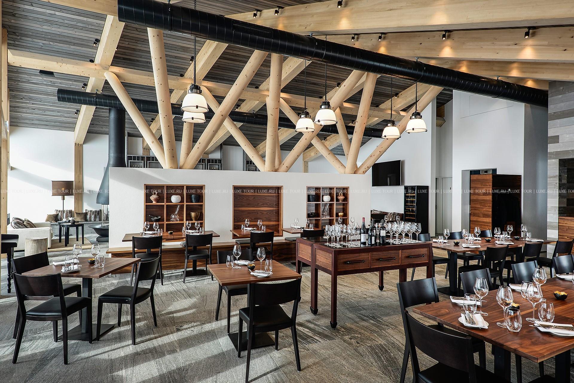 - Ресторан The Restaurant подает блюда швейцарской, европейской и азиатской кухни. Вниманию гостей – разнообразная коллекция изысканных вин и сыров из собственного сырного погреба. Посетители могут наблюдать за приготовлением блюд на четырех открытых кухнях. Часы работы: завтрак - с 07:00 до 11:00, обед - с 12:00 до 14:00, ужин - 18:00-22:00. Бранч по воскресеньям - с 12:00 до 15:00. В зимний сезон (даты варьируются) гостям предлагаются легкие закуски и снеки с 14:00 до 18:00. Дресс-код: smart casual.