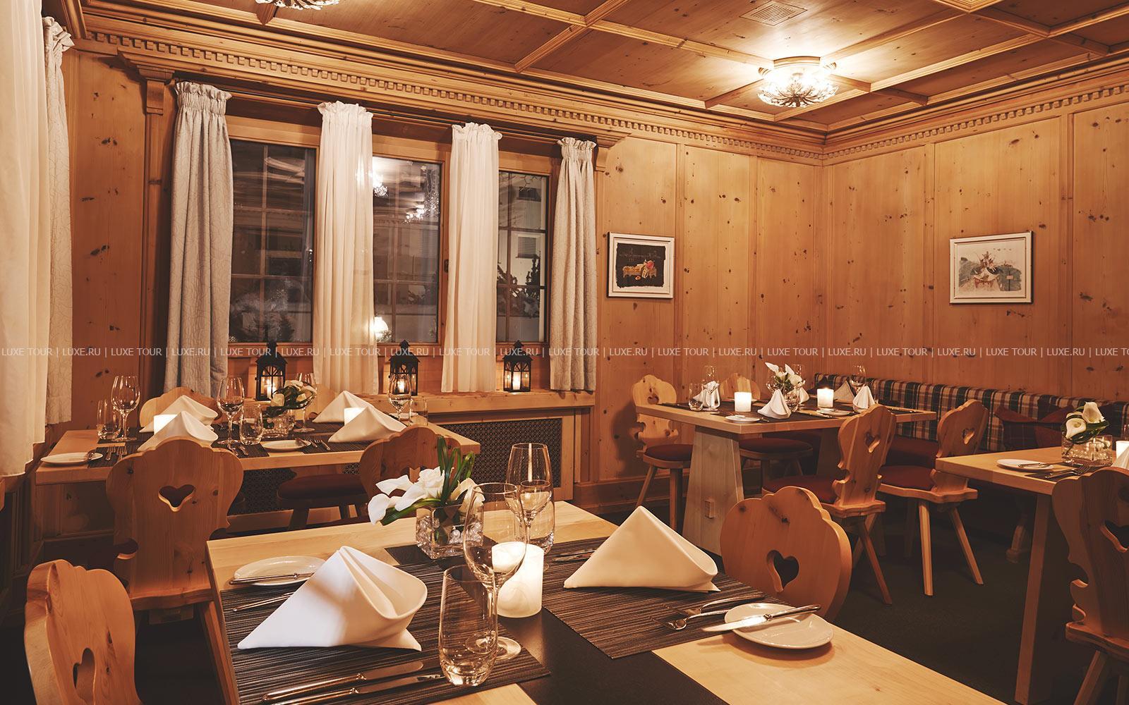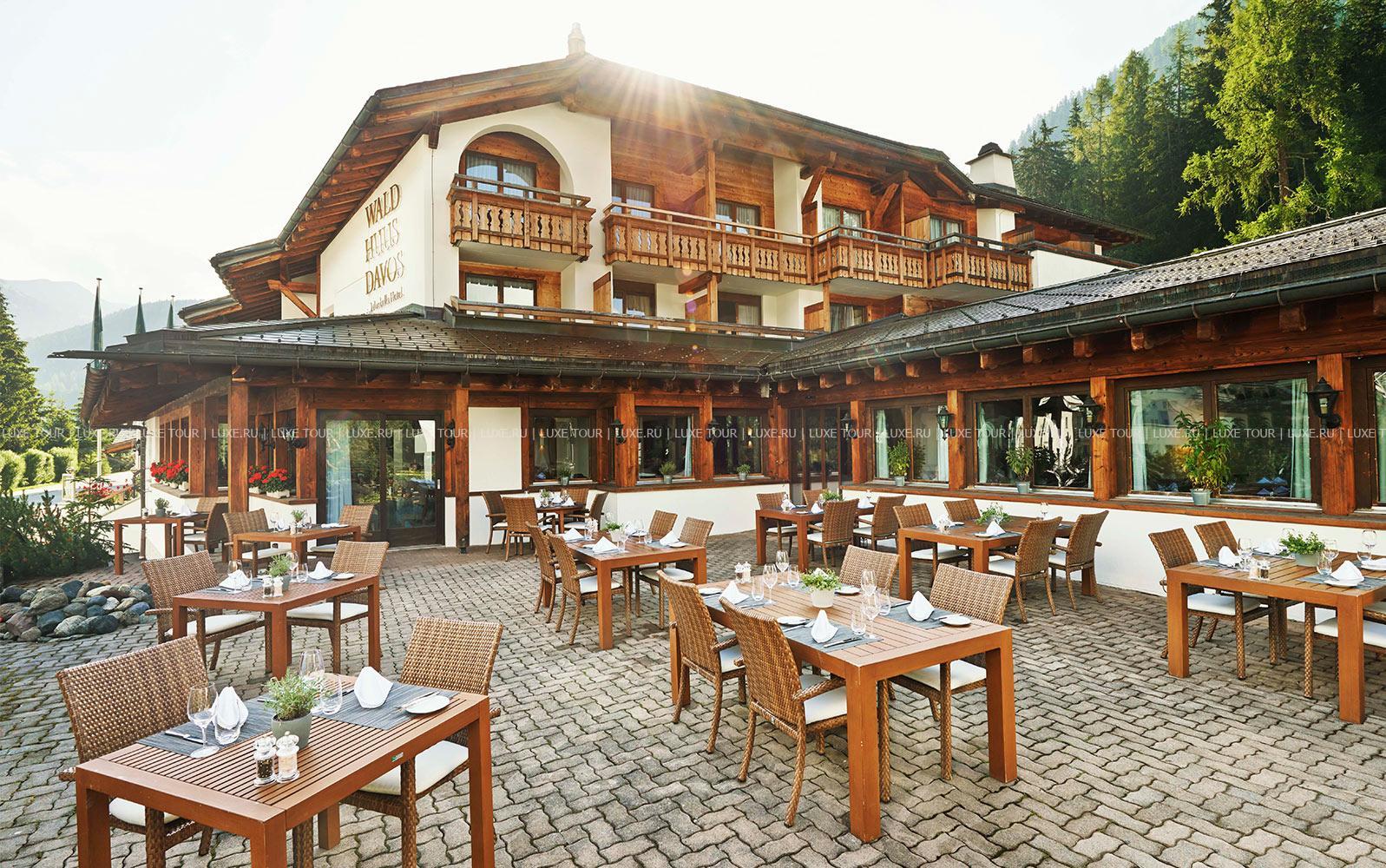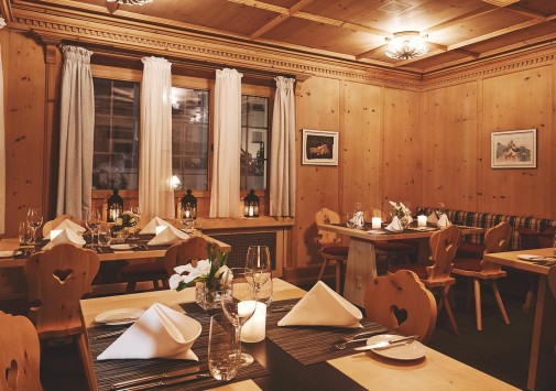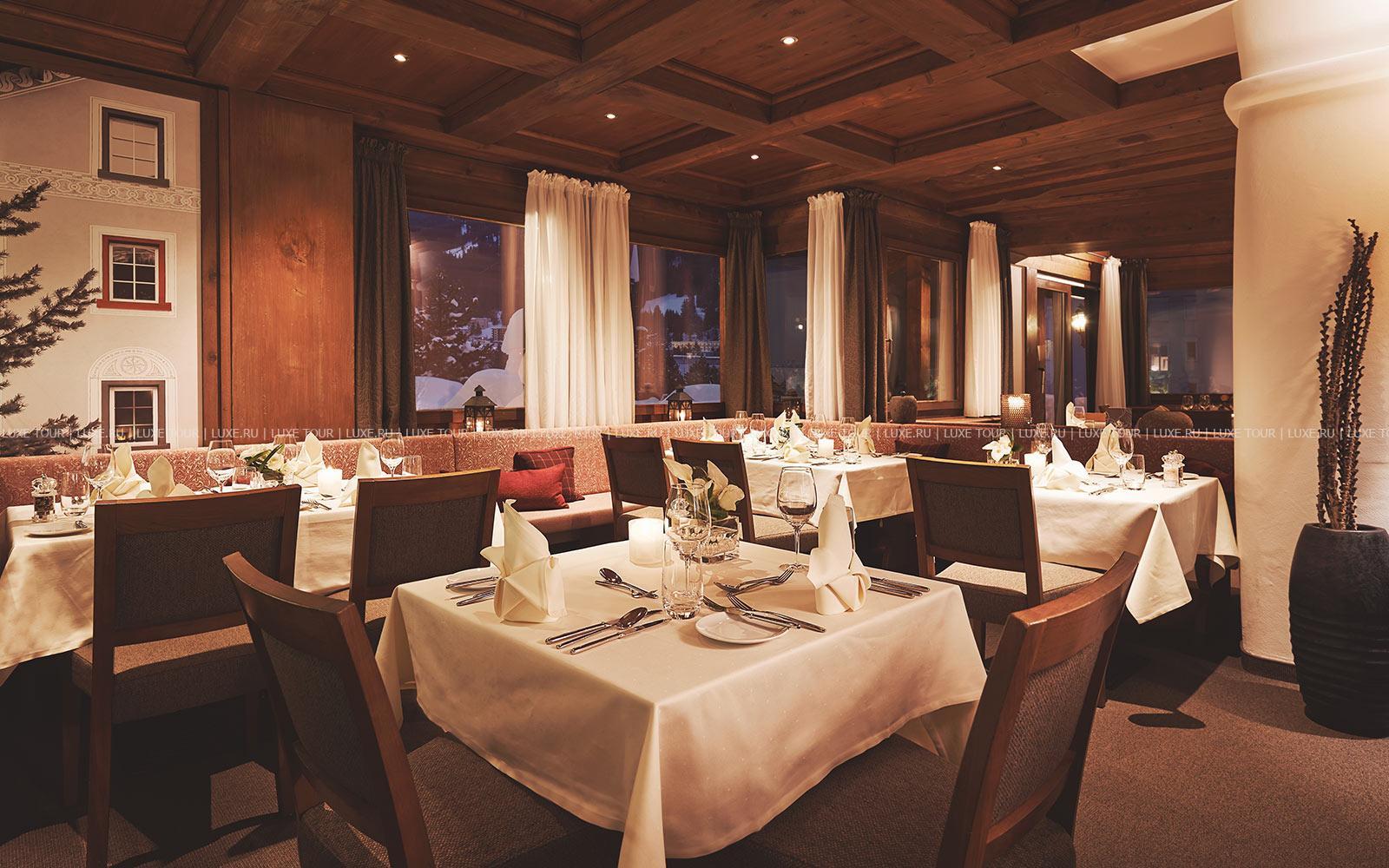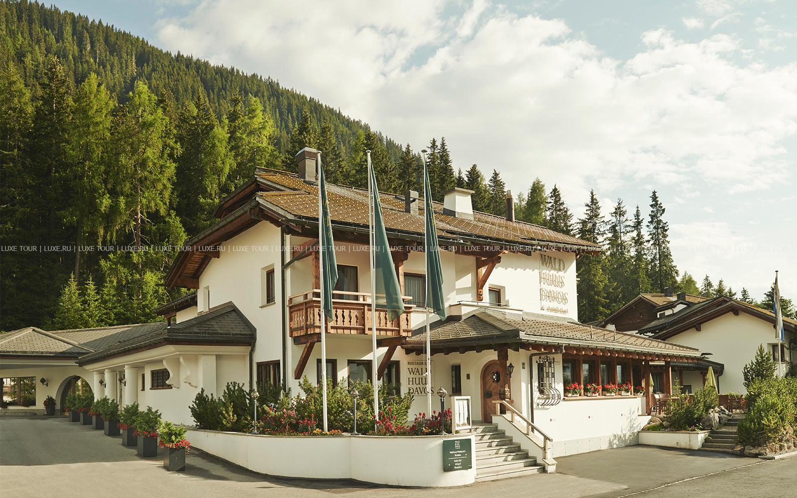 - Ресторан Waldhuus, выполненный в альпийском стиле – с отделкой из резной швейцарской сосны, предлагает деликатесы интернациональной и региональной кухни, приготовленные из отборных местных продуктов, а также богатую карту изысканных вин. Летом вкусными блюдами и винами можно насладиться на открытой террасе с панорамным видом.
