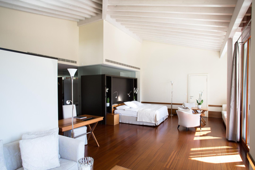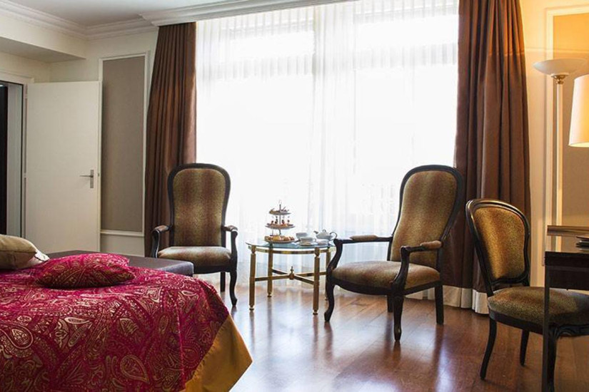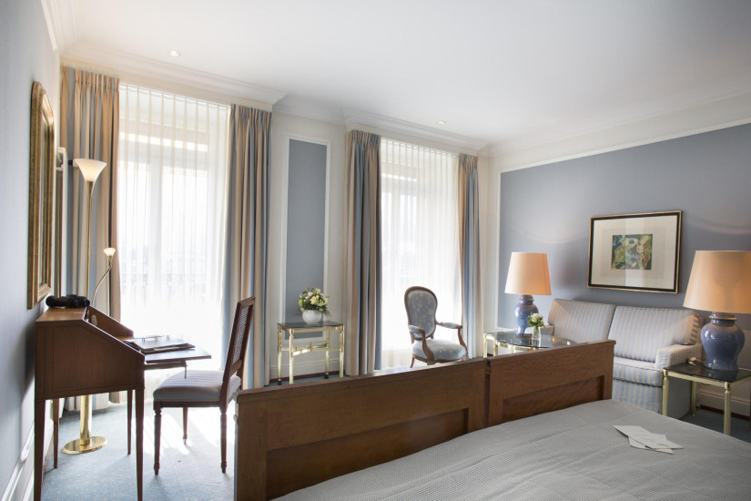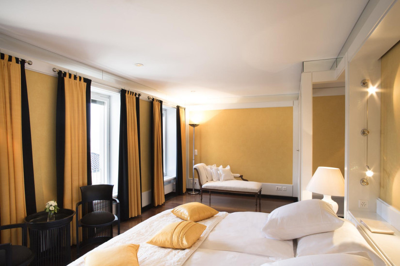 - 35 м2. Состоит из спальни с двумя кроватями twin, гостиной зоны с диваном, рабочей зоны с письменным столом, просторной ванной комнаты и гардеробной. Окна номера выходят на на крепость или Интерлакен.