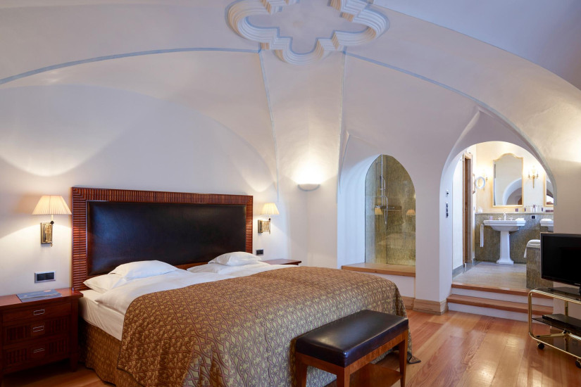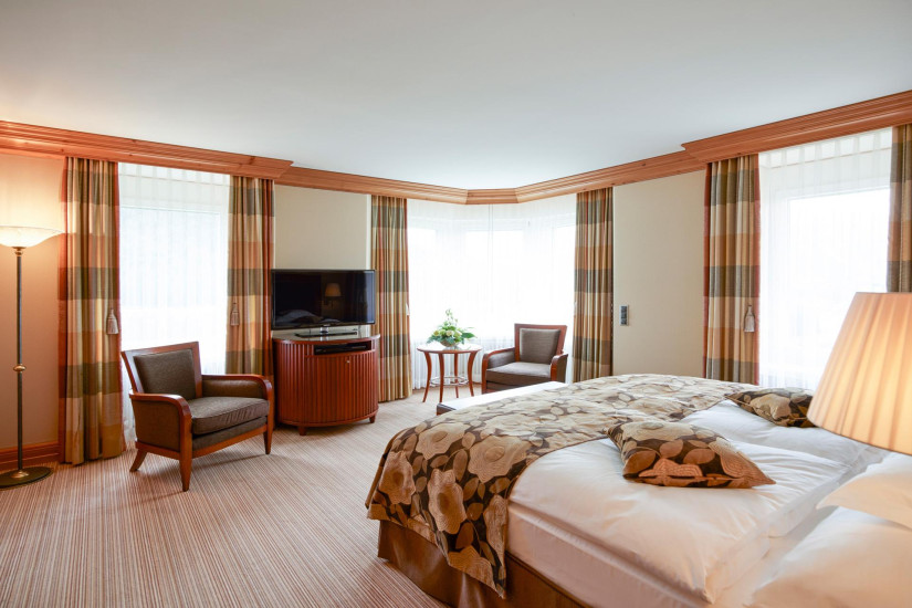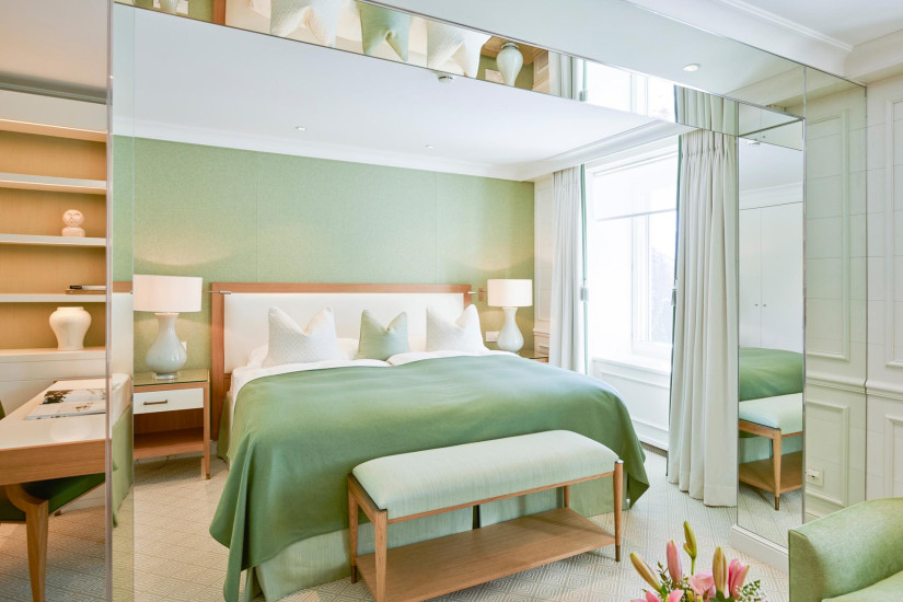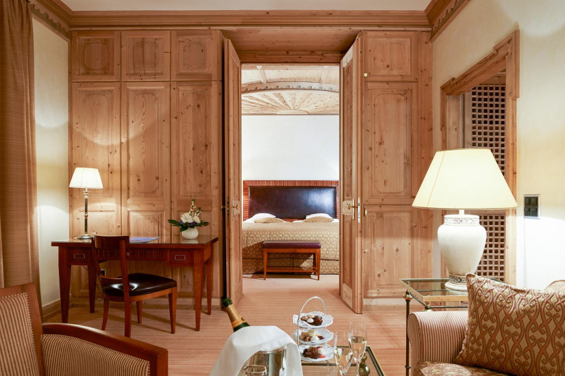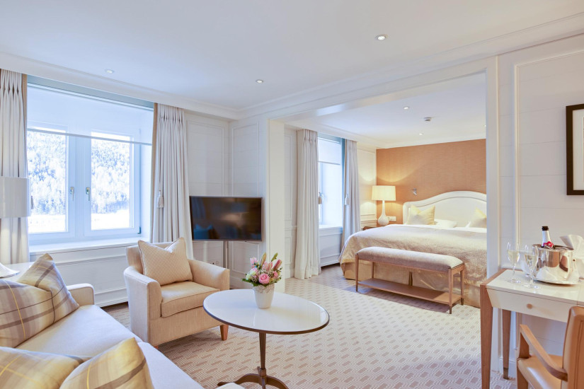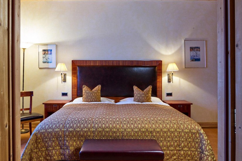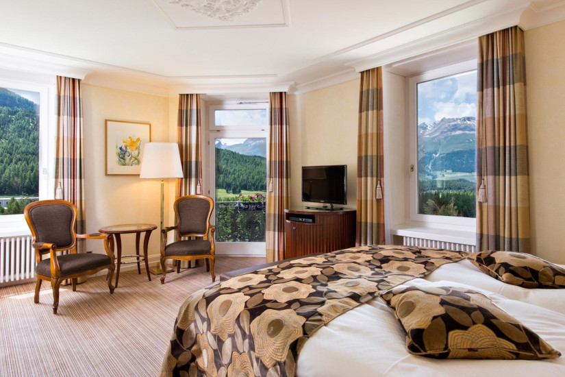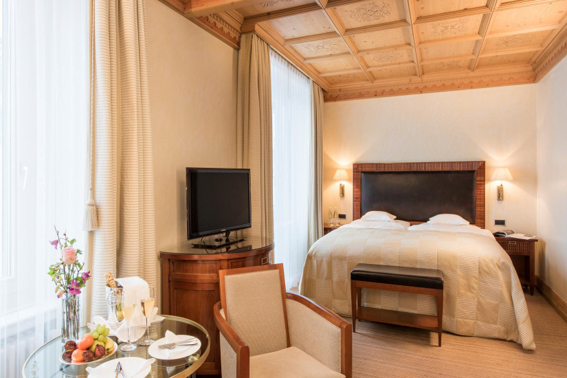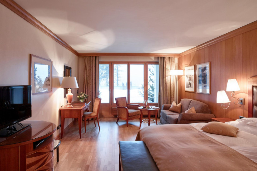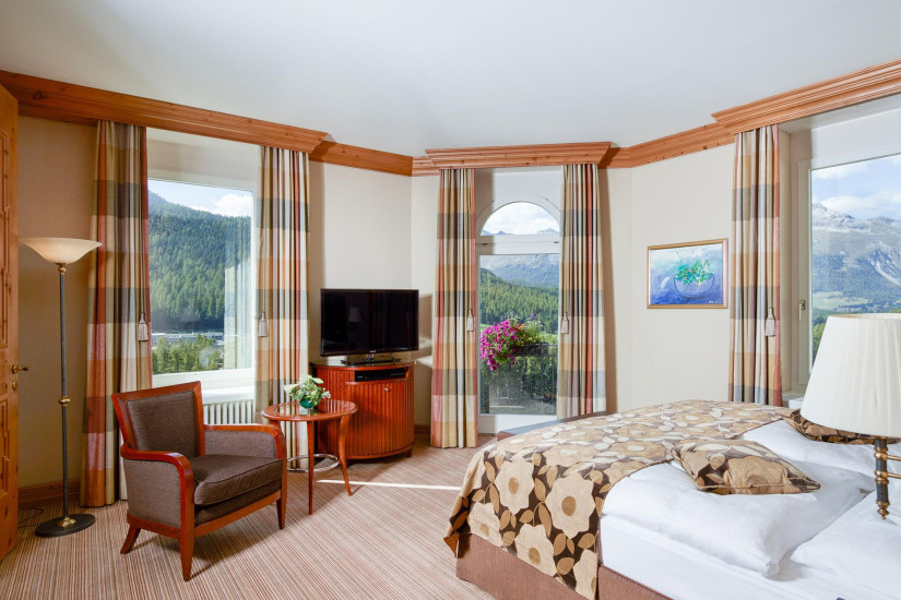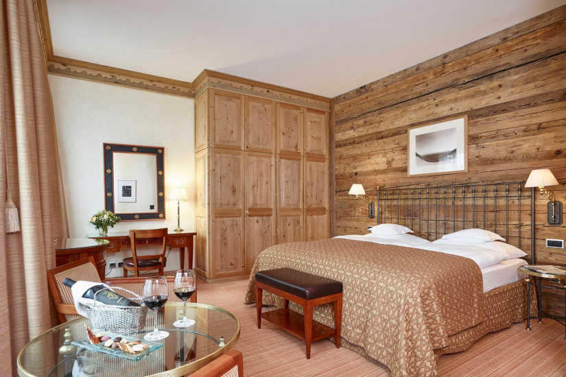 - 26-30 м2. Состоит из спальни, гардеробной (в некоторых номерах), ванной комнаты с ванной. Потолки украшены деревянными панелями с розетками в традиционном стиле кантона Граубюнден. Вид на ледник Roseg или на горный массив. Расположены в главном здании или в крыле Ganzoni. Возможно объединение с Double Room Standard или Single Room.