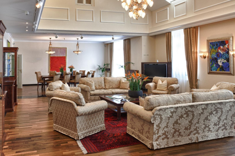 - 320 м2. Фешенебельный двухуровневый номер с галереей состоит из трех спален ( в одной спальне - кровать king-size, в двух других - две кровати twin) гостиной комнаты с камином, столовой, кухни, ванной комнаты с душем, ванной, и сауной, балкона с видом на горы. Гостям номер предоставляются услуги дворецкого. Максимальное размещение - 8 человек.