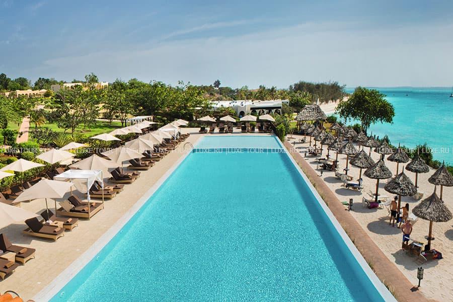 Hotel Riu Palace Zanzibar находится на замечательном пляже Нангви-Бич с белым песком и кристально чистой водой, где вы непременно почувствуете себя как в настоящем раю. На этом курорте в Занзибаре, в Танзании, предлагается бесплатный беспроводной доступ в Интернет и эксклюзивные услуги RIU Hotels & Resorts, благодаря которым вы сможете получить незабываемые впечатления от отпуска.Просторные номера этого отеля в Занзибаре отличаются превосходным дизайном. Во всех номерах есть бесплатный беспроводной доступ в Интернет, кондиционер, телевизор со спутниковыми каналами, мини-бар и балкон или терраса. Кроме того, в отеле есть виллы с частным бассейном для тех, кто желает насладиться отдыхом с роскошными деталями.В отеле Riu Palace Zanzibar вы можете освежиться в бассейне с видом на море, отдохнуть под теплым солнцем в шезлонге или отправиться на пляж, куда из отеля имеется прямой доступ. Что касается гастрономии, здесь есть главный ресторан, где на завтрак вас ожидает шведский стол с кулинарными шоу, а также 2 тематических ресторана, которые предлагают восхитительные кушанья. Если вы хотите попробовать лучшие снэки и аперитивы, в барах этого курорта в Занзибаре вам всегда предоставят первоклассное обслуживание.