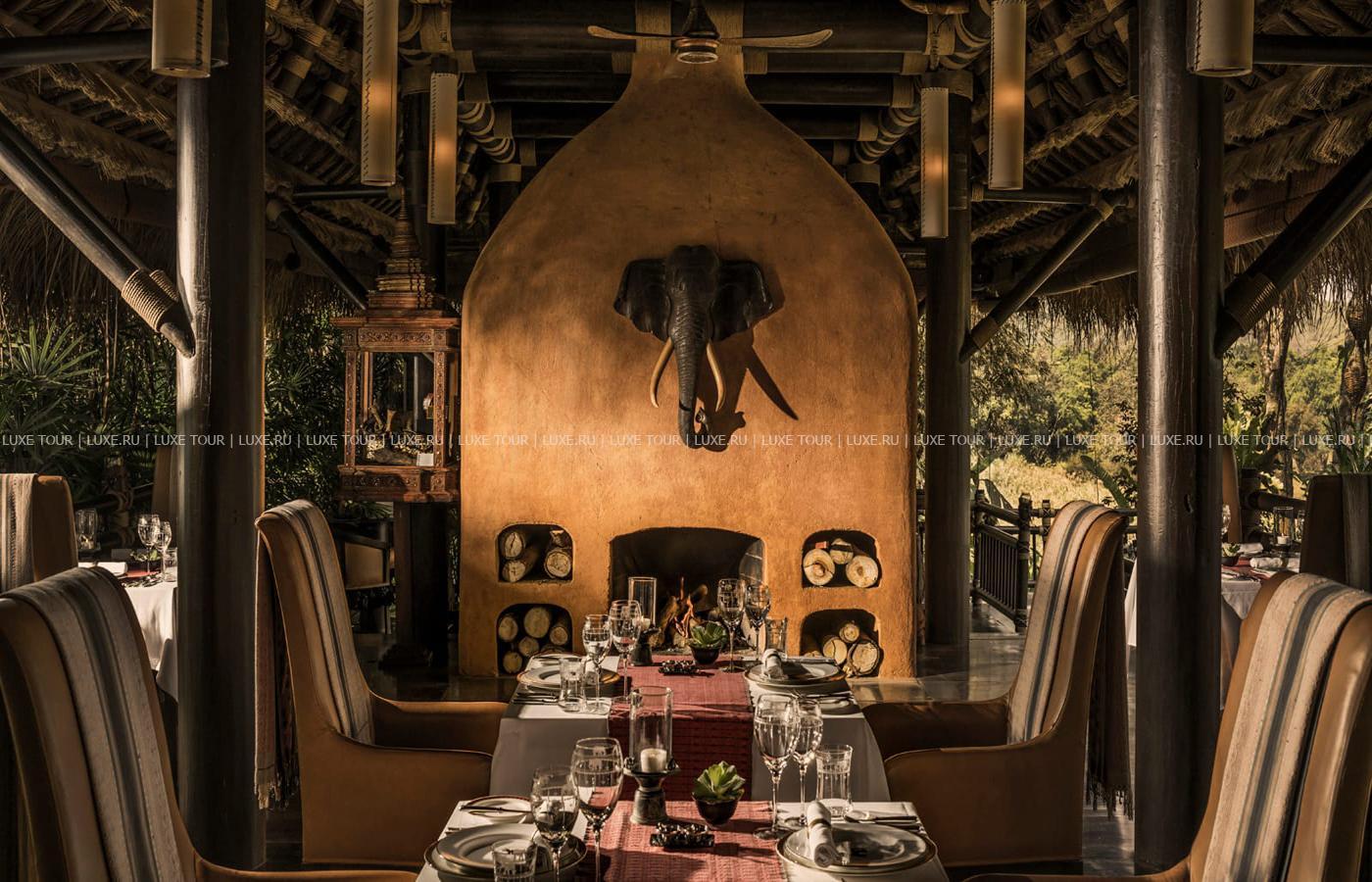 В стильном ресторане Nong Yao можно отведать оригинальные блюда Таиланда, Бирмы и Лаоса, а также блюда западной кухни, здесь же открыт уютный бар с камином. На веранде Burma Bar, с чудесным видом на реку и ландшафты Мьянмы, предлагаются местные деликатесы и напитки, а также барбекю и послеобеденный чай. В элегантном винном погребе отеля, отделанном деревом, предложена богатая коллекция вин со всех уголков мира, здесь также имеется небольшой дегустационный зал. В ресторане Elephant Camp, расположенном у загона со слонами, представлены блюда стран Золотого Треугольника, а вечерами здесь проходят шоу -программы, где можно увидеть национальные танцы этих стран. К услугам гостей – бизнес-центр, магазин сувениров. Four Seasons Tented Camp Golden Triangle сочетает современные комфортабельные условия и удивительную атмосферу уединенности и гармонии с экзотической природой легендарного Золотого Треугольника. Отель открылся в начале 2006 года.