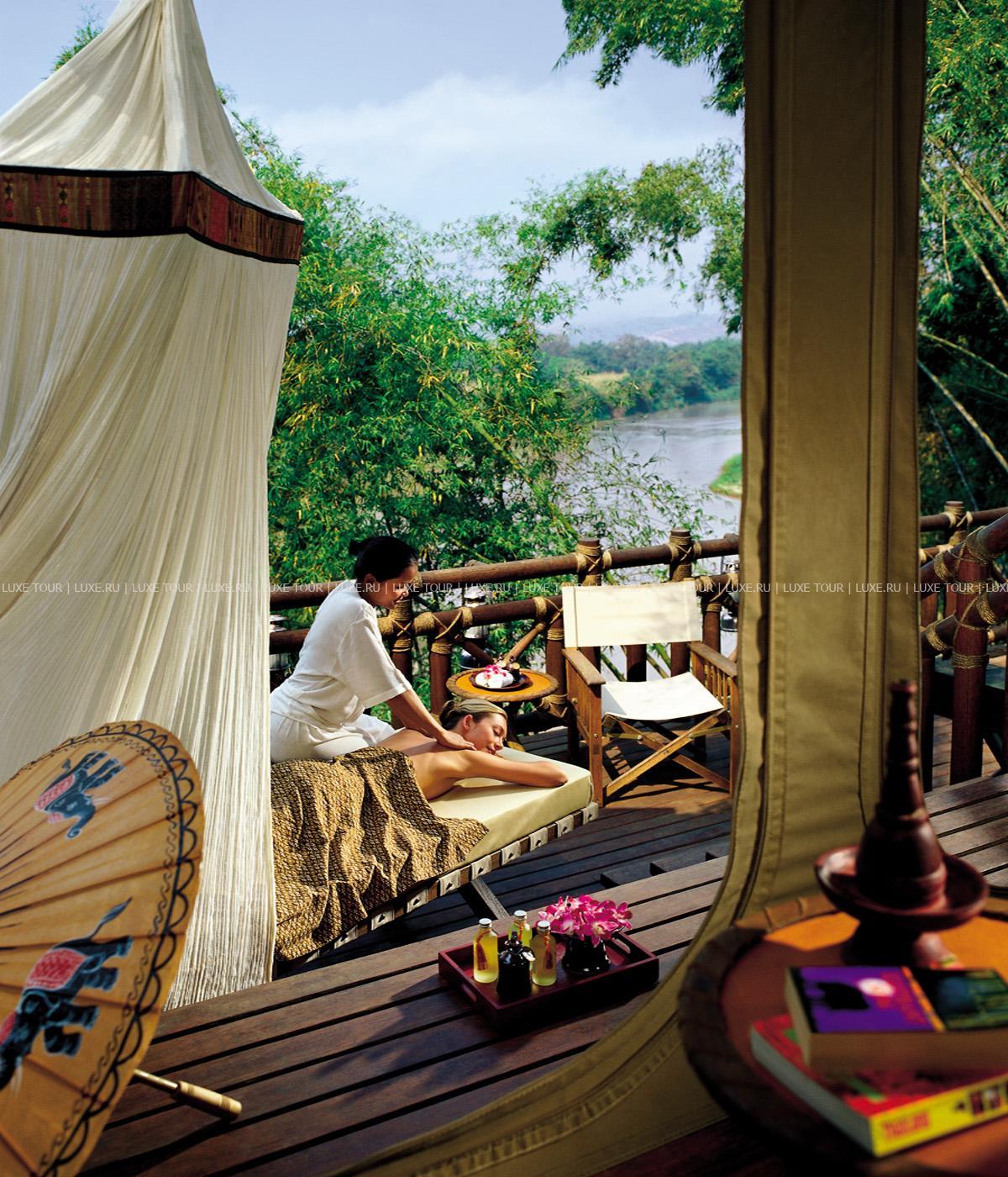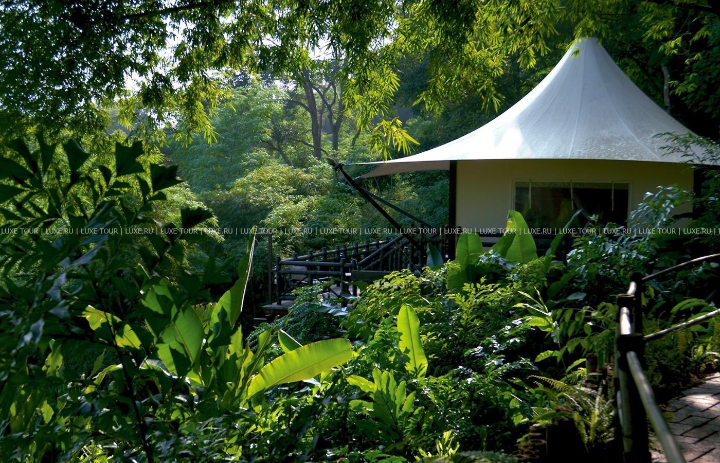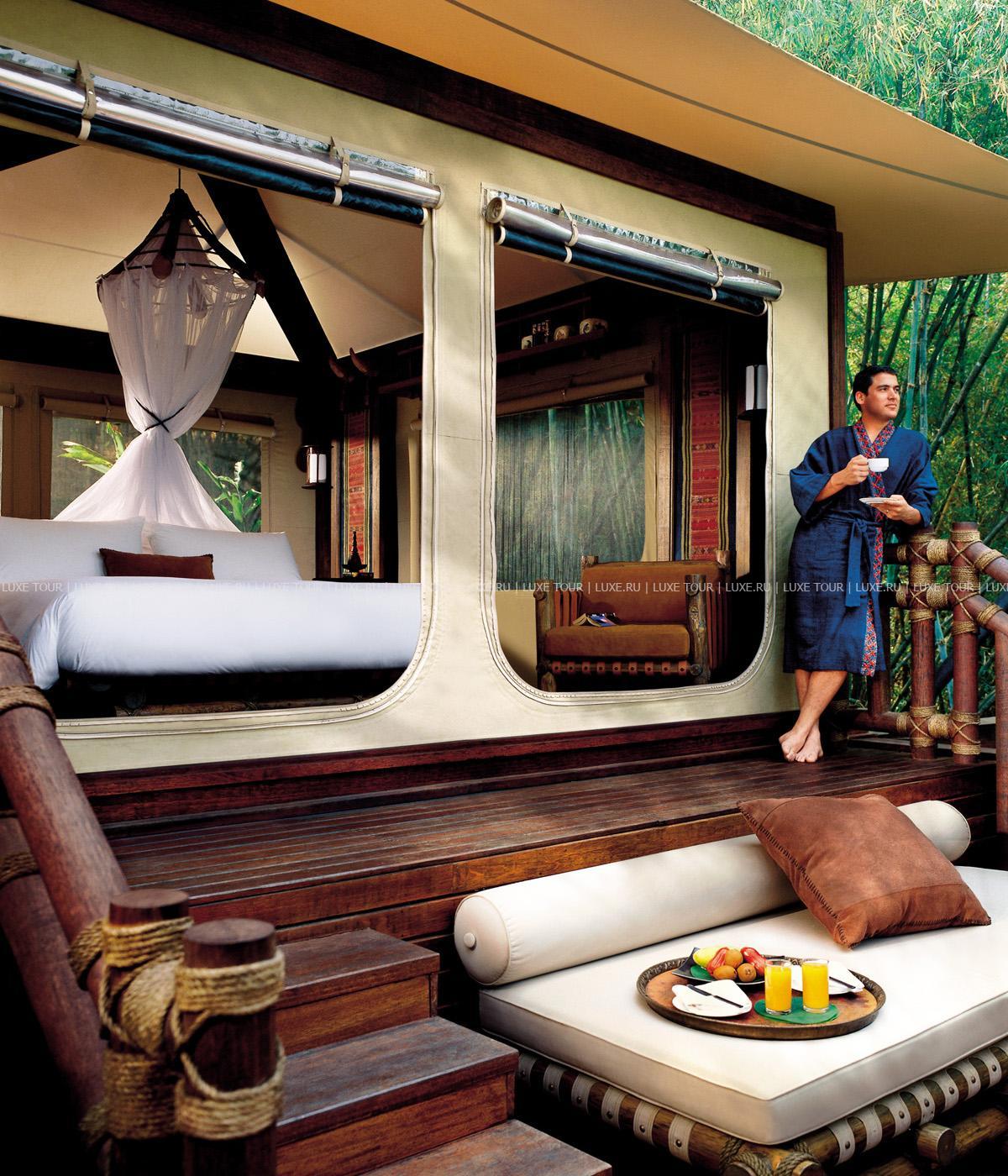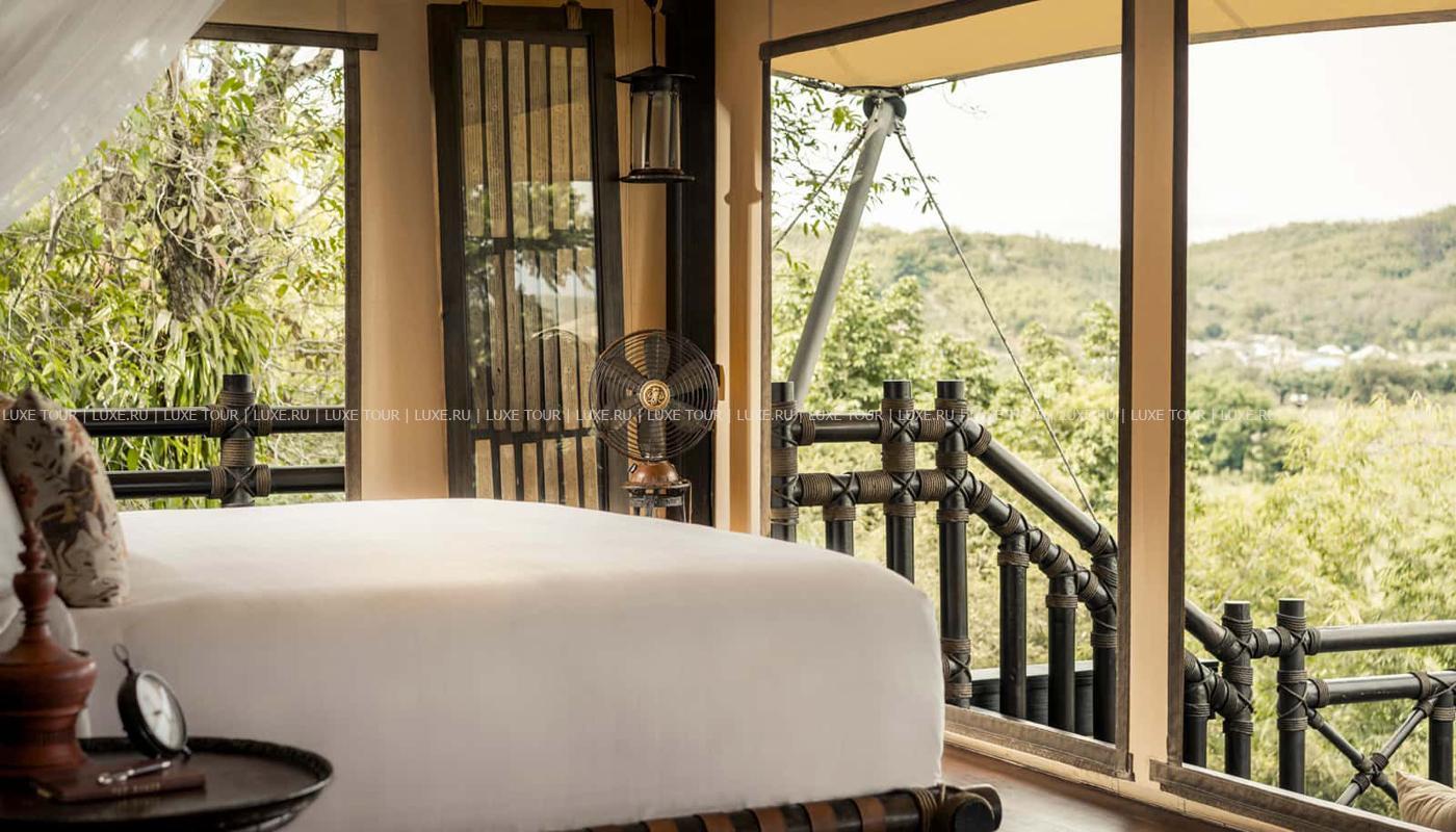 Там, где встречаются три древних азиатских государства, в окружении пышной зелени лесов, величественных горных склонов, у извилистой реки Ruak, расположился уникальный Four Seasons Tented Camp Golden Triangle, открытый в 2006 году и включающий всего 15 отдельно стоящих бунгало - шатров, выполненных в стиле палаточного лагеря исследовательских экспедиций 19 века и расположенных на живописном горном склоне. В просторных номерах – индивидуальные интерьеры с отделкой из тикового дерева, удобной мебелью ручной работы, кроватями под пологами из тончайшей ткани, украшенные тайскими артефактами, в каждом из номеров имеются оригинальные медные ванны, отделанные искусной чеканкой, экзотические «ливневые» души и просторные террасы с изумительным видом на реку Ruak, ландшафты Мьянмы, лаосские горы и густые джунгли Золотого Треугольника. Отель располагает СПА Центром Jungle Spa, расположенном среди бамбуковых лесов и зелени сада, м включающем зону с ванными и душевыми и 2 открытых процедурных павильона, предлагающих широкий спектр различных видов массажа и СПА процедур, основанных на традиционных и современных тайских методиках и с использованием местных натуральных продуктов, включая горные травы. В Four Seasons Tented Camp Golden Triangle находится открытый бассейн с джакузи, предлагаются прогулки на слонах по джунглям, экскурсии в питомник слонов и обучение дрессуре этих животных, речные прогулки по реке Меконг, рыбалка, путешествия в горы, экскурсии по Золотому Треугольнику, курсы тайской кулинарии и тайских традиционных ремесел, лекции о культуре и истории северного Таиланда.