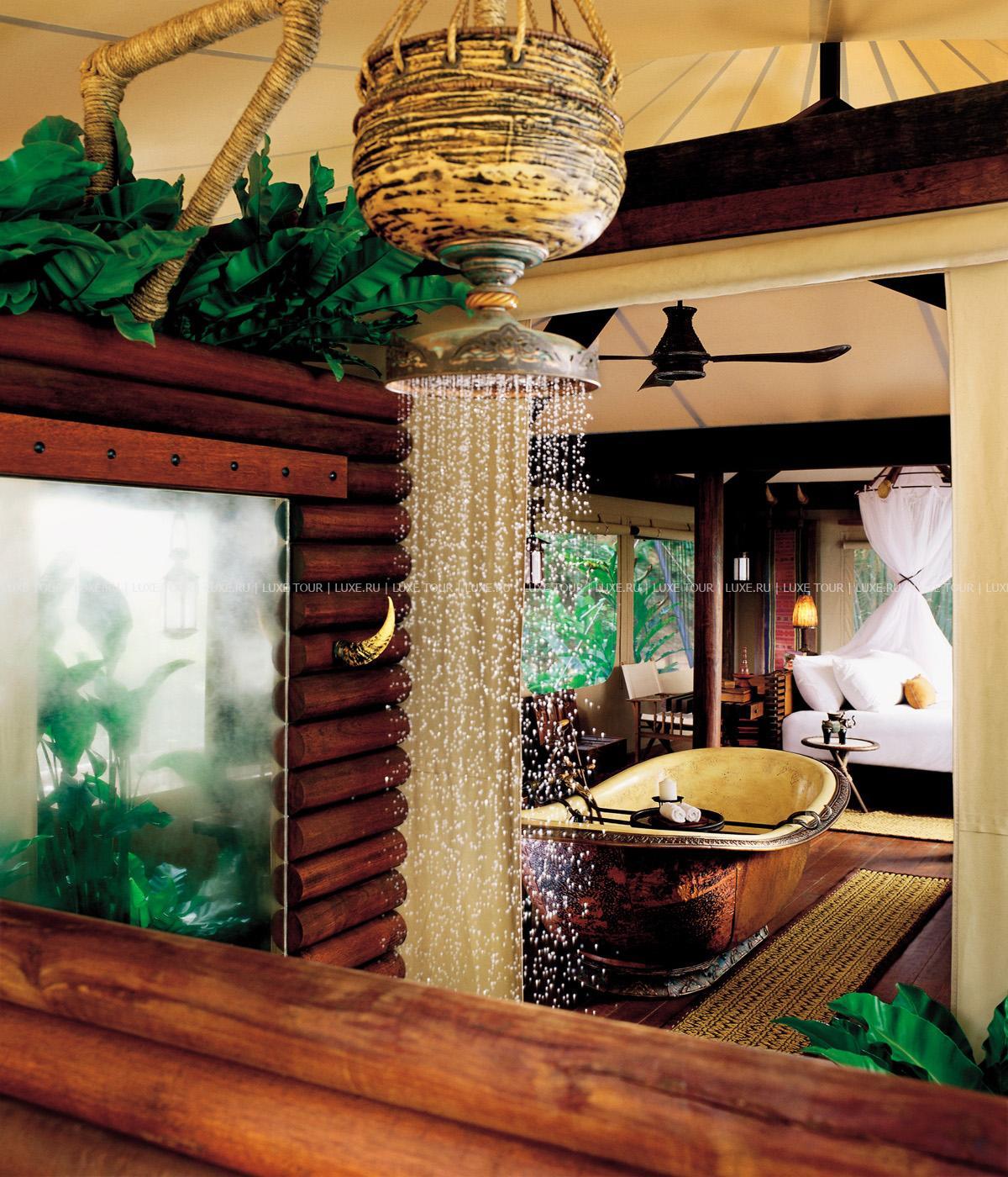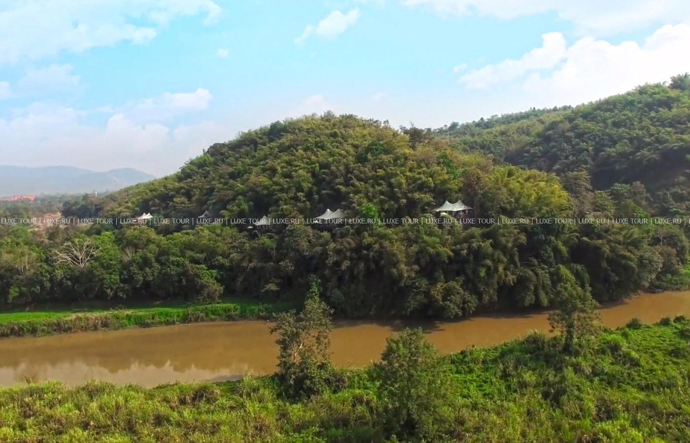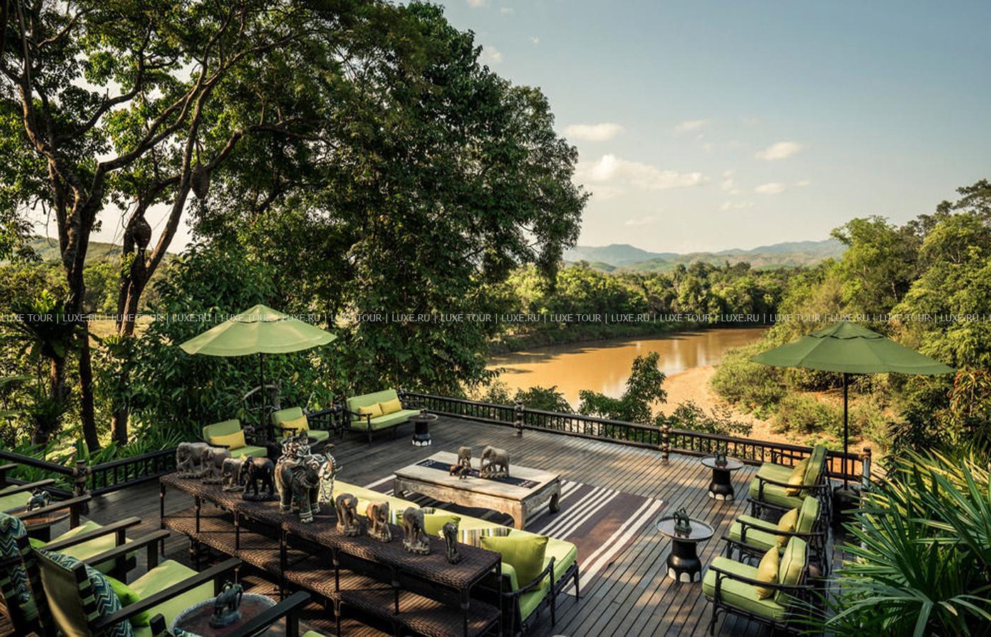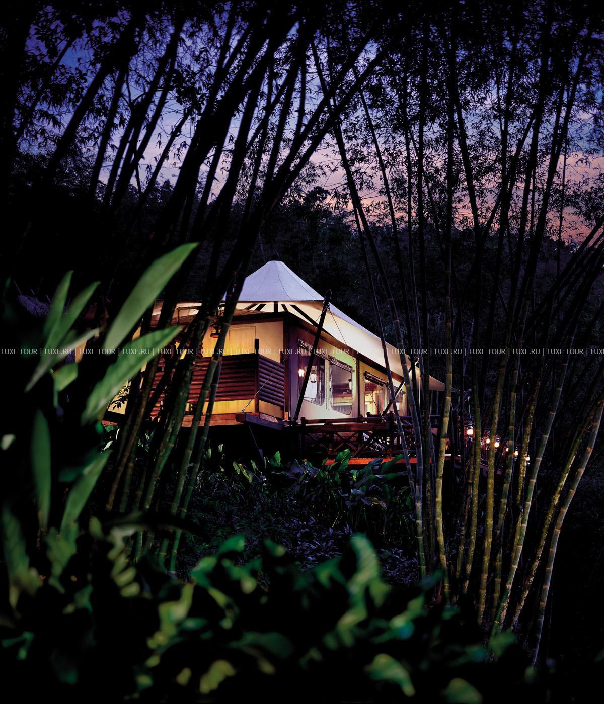 Там, где встречаются три древних азиатских государства, в окружении пышной зелени лесов, величественных горных склонов, у извилистой реки Ruak, расположился уникальный Four Seasons Tented Camp Golden Triangle, открытый в 2006 году и включающий всего 15 отдельно стоящих бунгало - шатров, выполненных в стиле палаточного лагеря исследовательских экспедиций 19 века и расположенных на живописном горном склоне. В просторных номерах – индивидуальные интерьеры с отделкой из тикового дерева, удобной мебелью ручной работы, кроватями под пологами из тончайшей ткани, украшенные тайскими артефактами, в каждом из номеров имеются оригинальные медные ванны, отделанные искусной чеканкой, экзотические «ливневые» души и просторные террасы с изумительным видом на реку Ruak, ландшафты Мьянмы, лаосские горы и густые джунгли Золотого Треугольника. Отель располагает СПА Центром Jungle Spa, расположенном среди бамбуковых лесов и зелени сада, м включающем зону с ванными и душевыми и 2 открытых процедурных павильона, предлагающих широкий спектр различных видов массажа и СПА процедур, основанных на традиционных и современных тайских методиках и с использованием местных натуральных продуктов, включая горные травы. В Four Seasons Tented Camp Golden Triangle находится открытый бассейн с джакузи, предлагаются прогулки на слонах по джунглям, экскурсии в питомник слонов и обучение дрессуре этих животных, речные прогулки по реке Меконг, рыбалка, путешествия в горы, экскурсии по Золотому Треугольнику, курсы тайской кулинарии и тайских традиционных ремесел, лекции о культуре и истории северного Таиланда.