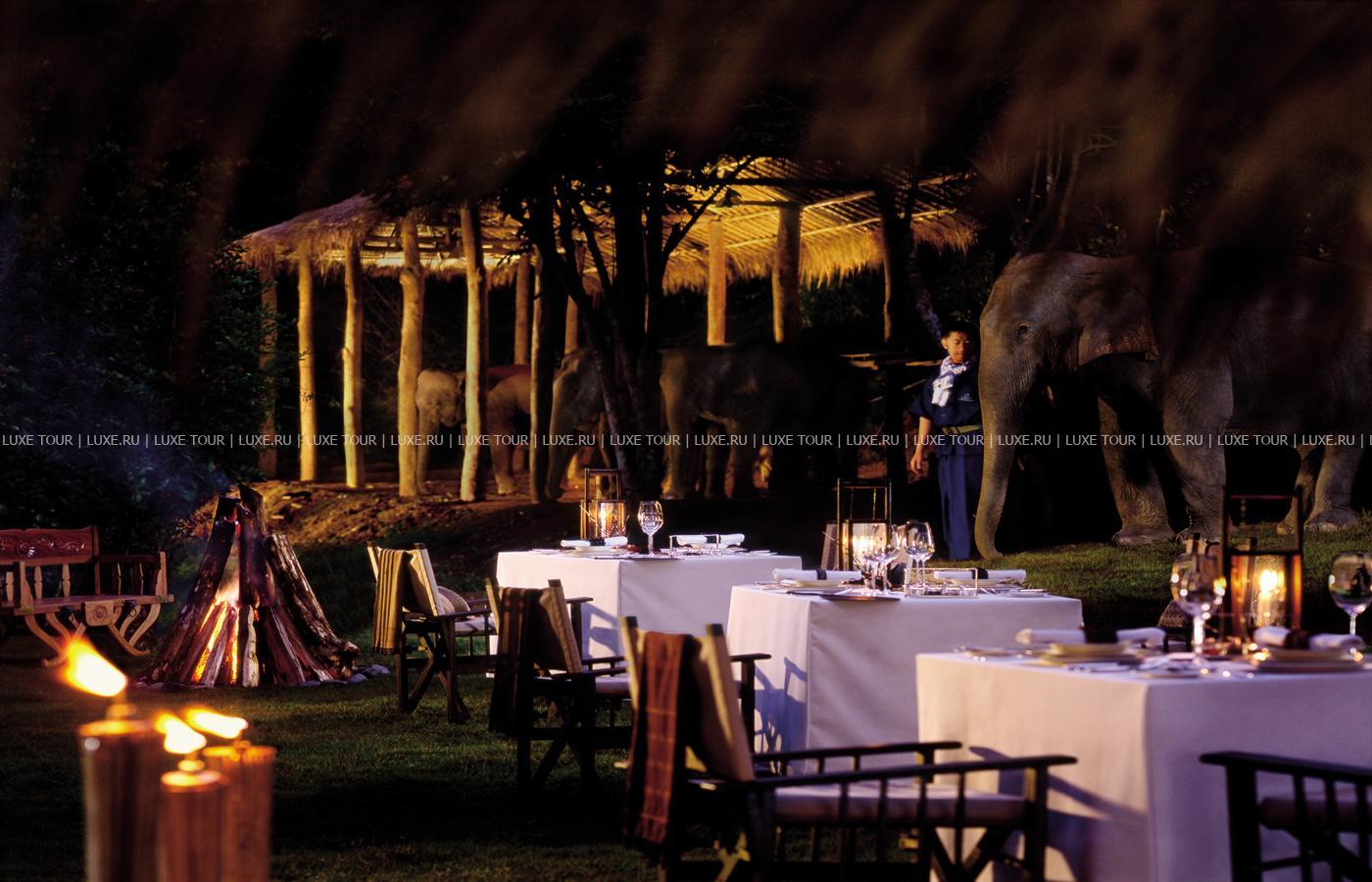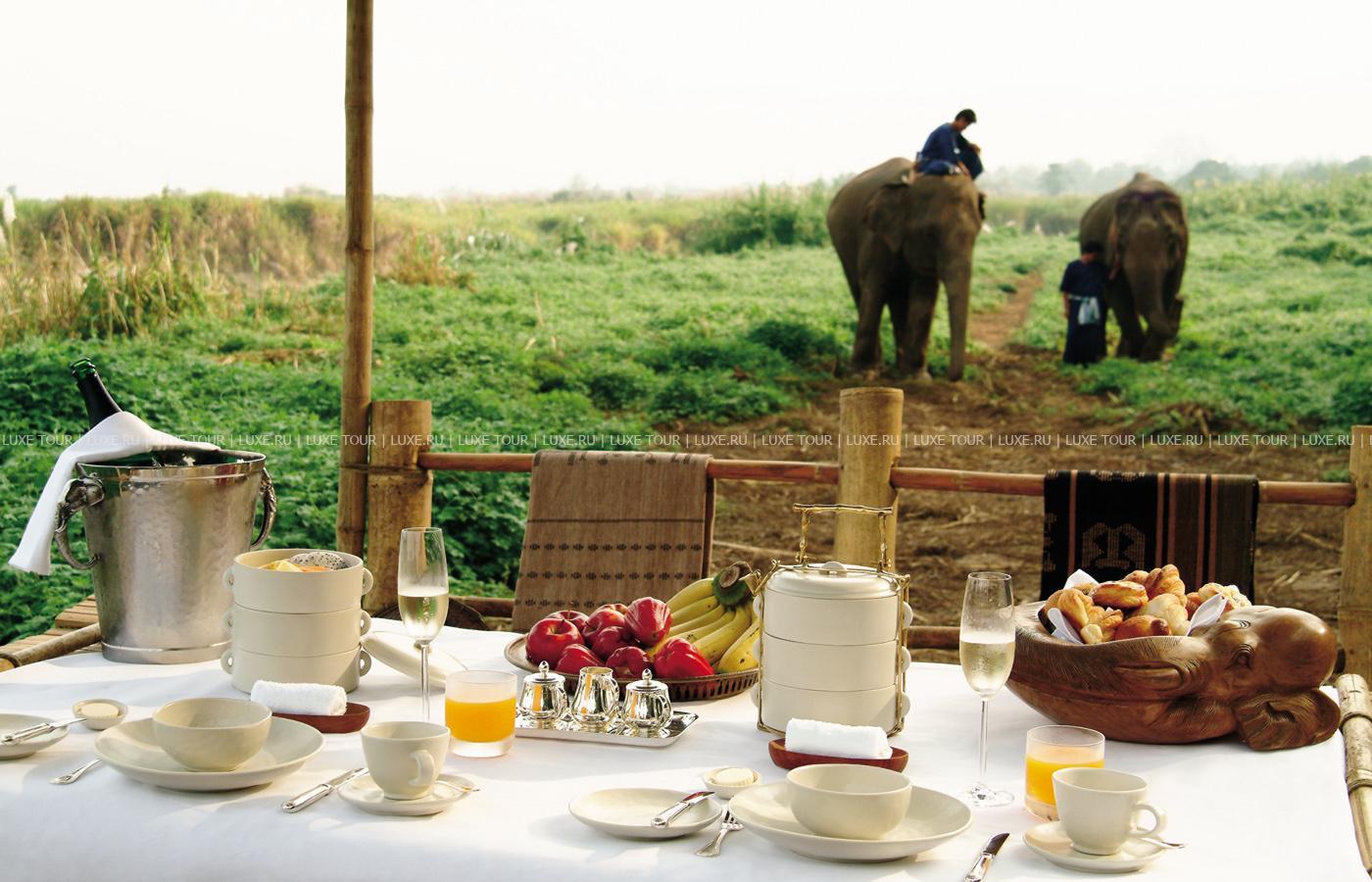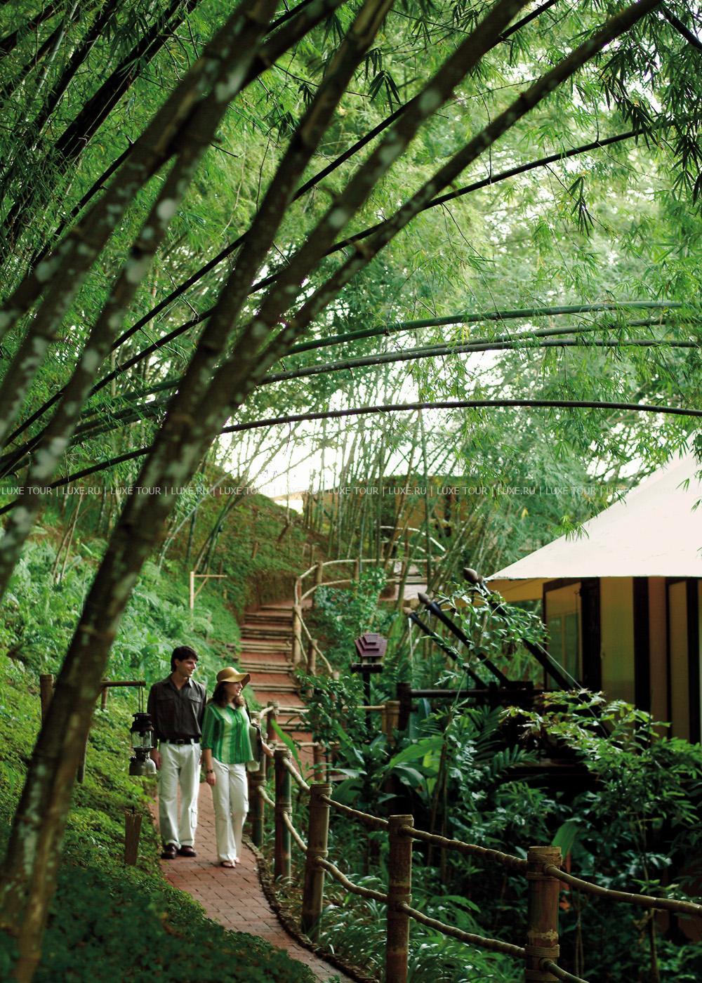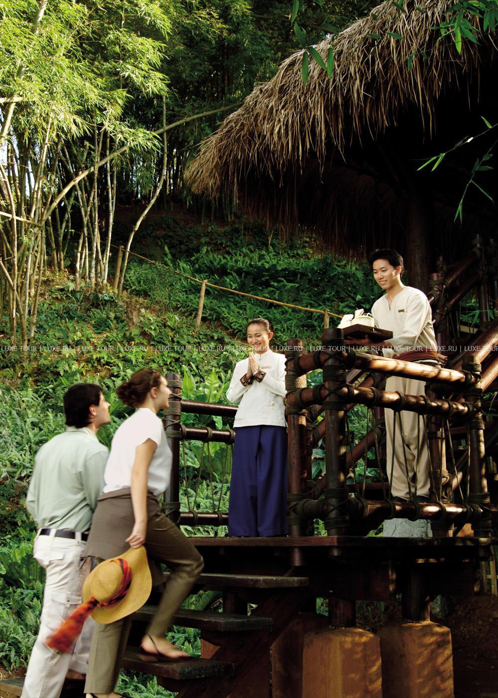 Там, где встречаются три древних азиатских государства, в окружении пышной зелени лесов, величественных горных склонов, у извилистой реки Ruak, расположился уникальный Four Seasons Tented Camp Golden Triangle, открытый в 2006 году и включающий всего 15 отдельно стоящих бунгало - шатров, выполненных в стиле палаточного лагеря исследовательских экспедиций 19 века и расположенных на живописном горном склоне. В просторных номерах – индивидуальные интерьеры с отделкой из тикового дерева, удобной мебелью ручной работы, кроватями под пологами из тончайшей ткани, украшенные тайскими артефактами, в каждом из номеров имеются оригинальные медные ванны, отделанные искусной чеканкой, экзотические «ливневые» души и просторные террасы с изумительным видом на реку Ruak, ландшафты Мьянмы, лаосские горы и густые джунгли Золотого Треугольника. Отель располагает СПА Центром Jungle Spa, расположенном среди бамбуковых лесов и зелени сада, м включающем зону с ванными и душевыми и 2 открытых процедурных павильона, предлагающих широкий спектр различных видов массажа и СПА процедур, основанных на традиционных и современных тайских методиках и с использованием местных натуральных продуктов, включая горные травы. В Four Seasons Tented Camp Golden Triangle находится открытый бассейн с джакузи, предлагаются прогулки на слонах по джунглям, экскурсии в питомник слонов и обучение дрессуре этих животных, речные прогулки по реке Меконг, рыбалка, путешествия в горы, экскурсии по Золотому Треугольнику, курсы тайской кулинарии и тайских традиционных ремесел, лекции о культуре и истории северного Таиланда.