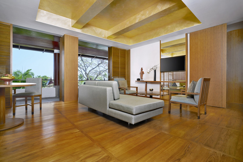 - 102 м2. Расположен на 1 этаже основного здания, состоит из спальни, гардеробной, гостиной с обеденной зоной и выходом к бассейну, ванной комнаты с джакузи, террасы с обеденной зоной, душем и зоной отдыха, с видом на море. Гостям предоставляются услуги дворецкого. Может объединяться с номером Ocean Room.
