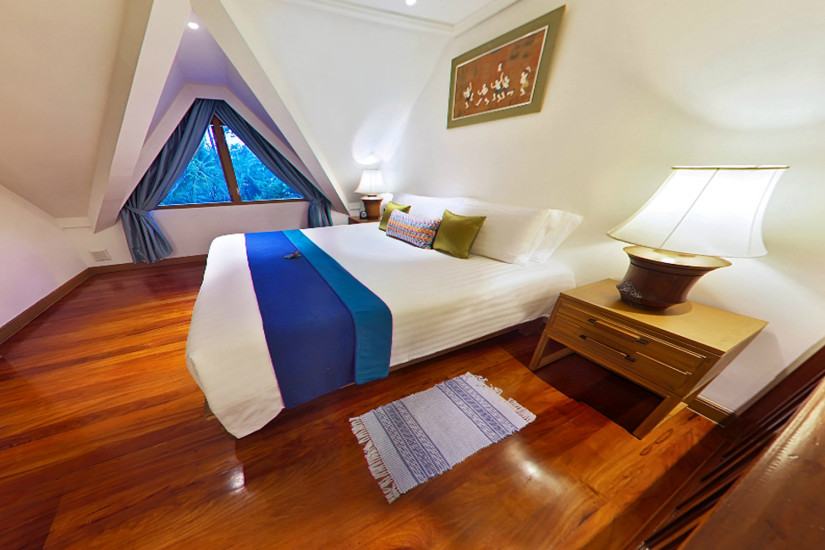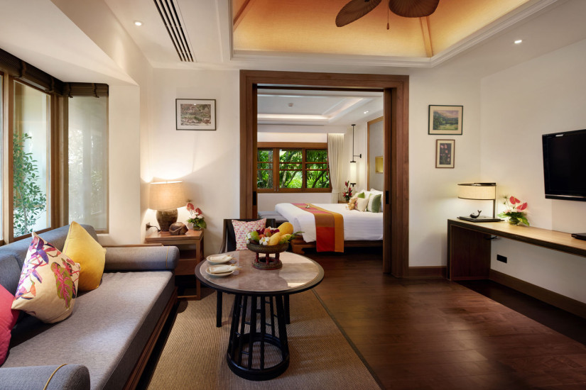 - 91 м2. Состоит из двух уровней: на верхнем уровне располагается спальня с двуспальной кроватью, на нихнем уровне – вторая спальня с двумя кроватями twin и ванной комнатой, отдельная гостиная, дополнительная ванная комната, балконы при спальне и гостиной с видом на бассейн и сады. Номера располагаются в главном здании.