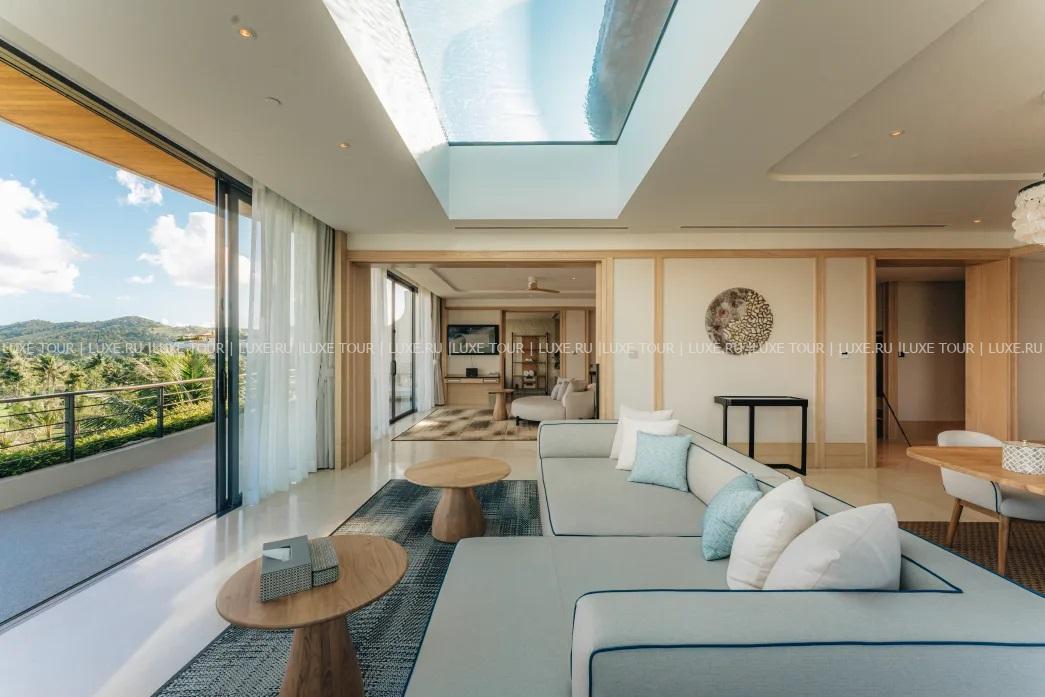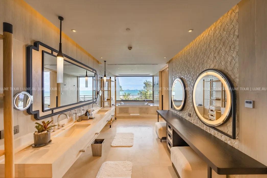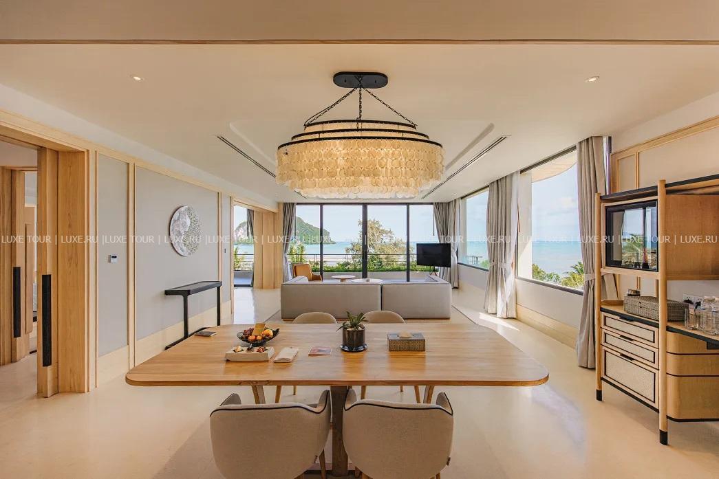 366 м2. Роскошный двухуровневый номер состоит из спальни с кроватью king-size, гостиной, столовой, кухни, гардеробной, ванной комнаты открытого плана с ванной и двумя душами, террасы с большим бассейном, душем на открытом воздухе, зоной отдыха, обеденной зоной и панорамным видом на море и карстовые острова. Номера расположены на верхнем этаже. Максимальное размещение – 2 взрослых + 1 ребенок. Гостям номера предоставляются услуги дворецкого.