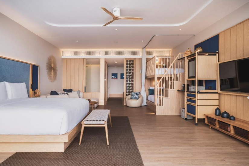 - 91 м2. Состоит из спальни с кроватью king-size или двумя кроватями twin, детской зоны с двухъярусной кроватью, гостиной зоны, гардеробной, ванной комнаты с ванной и душем, в некоторых номерах терраса с зоной отдыха и видом на море. Максимальное размещение – 2 взрослых + 2 ребенка.