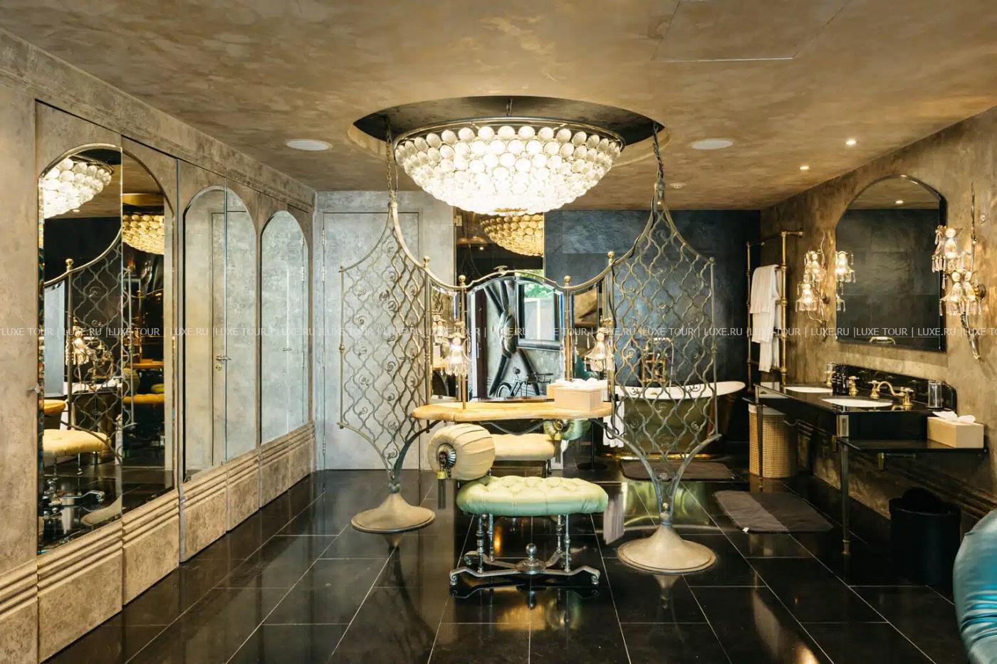 580 м2. Состоит из трех спален с кроватями king-size, гостиной с обеденной зоной, гардеробной, ванной комнаты, спа-зоны, мебелированной террасы с бассейном. Максимальное размещение — 6 человек.
