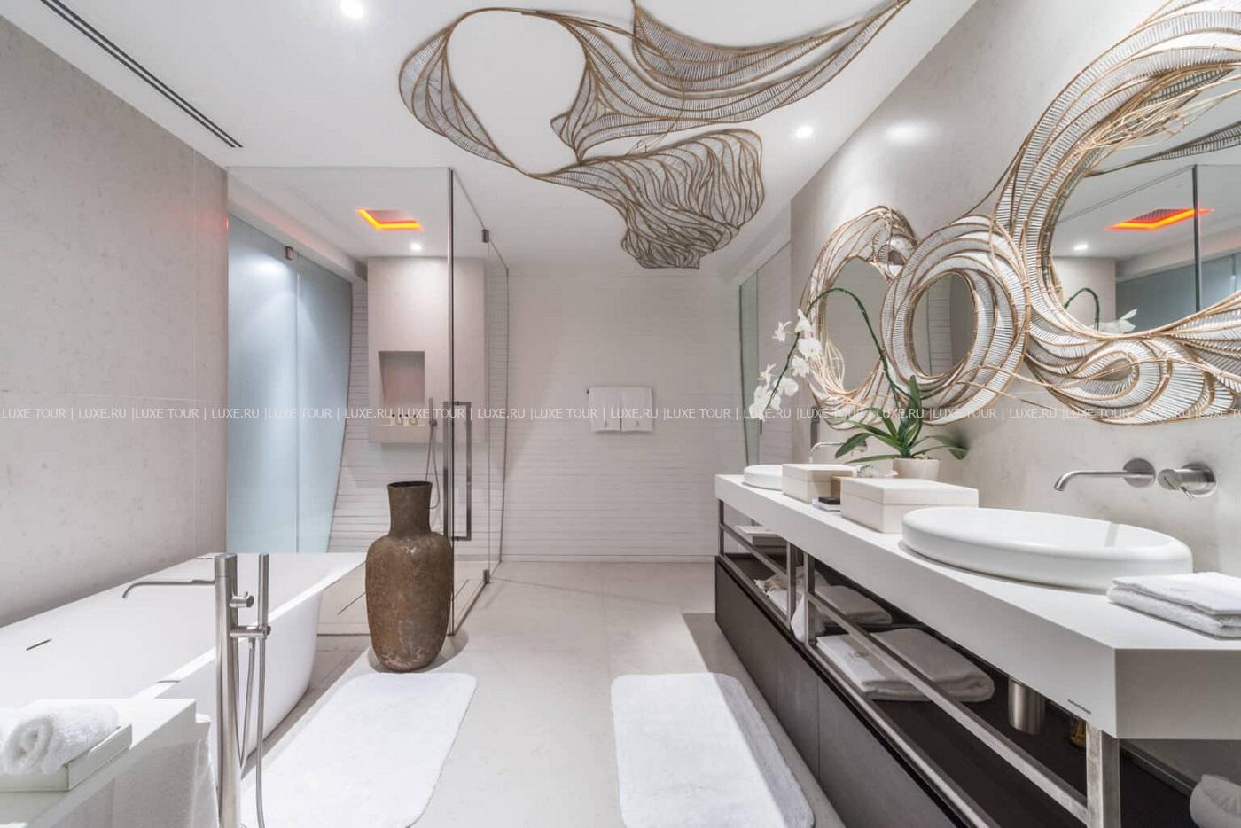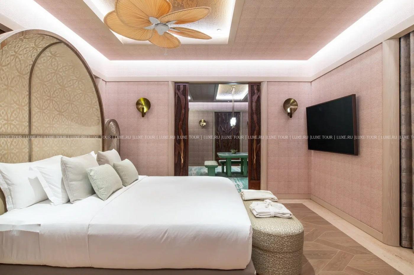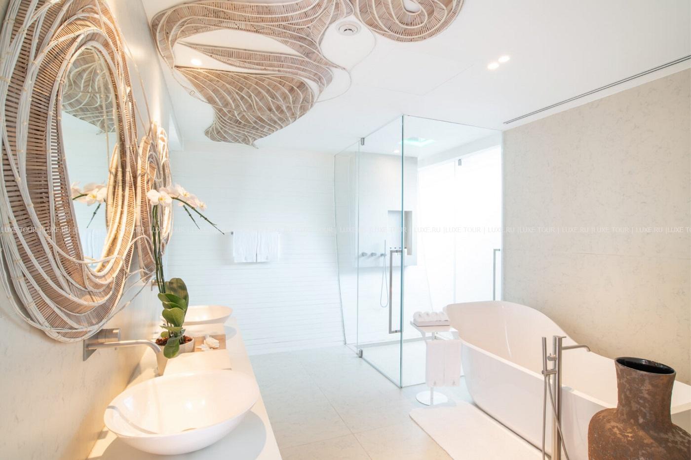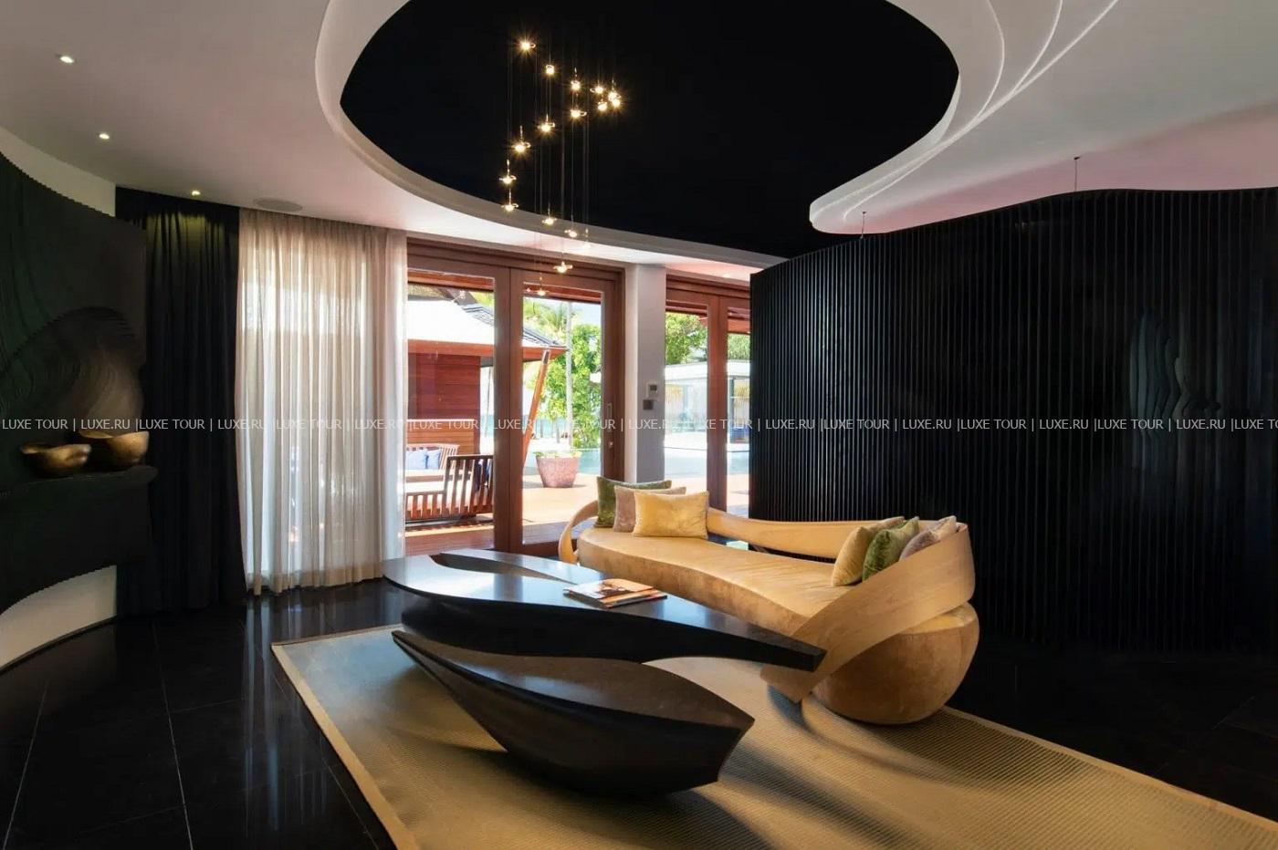 548 м2. Состоит из трех спален с кроватями king-size, гостиной, гардеробной, ванной комнаты, комнаты для спа-процедур, мебелированной террасы с бассейном и выходом на пляж. Максимальное размещение — 6 человек.