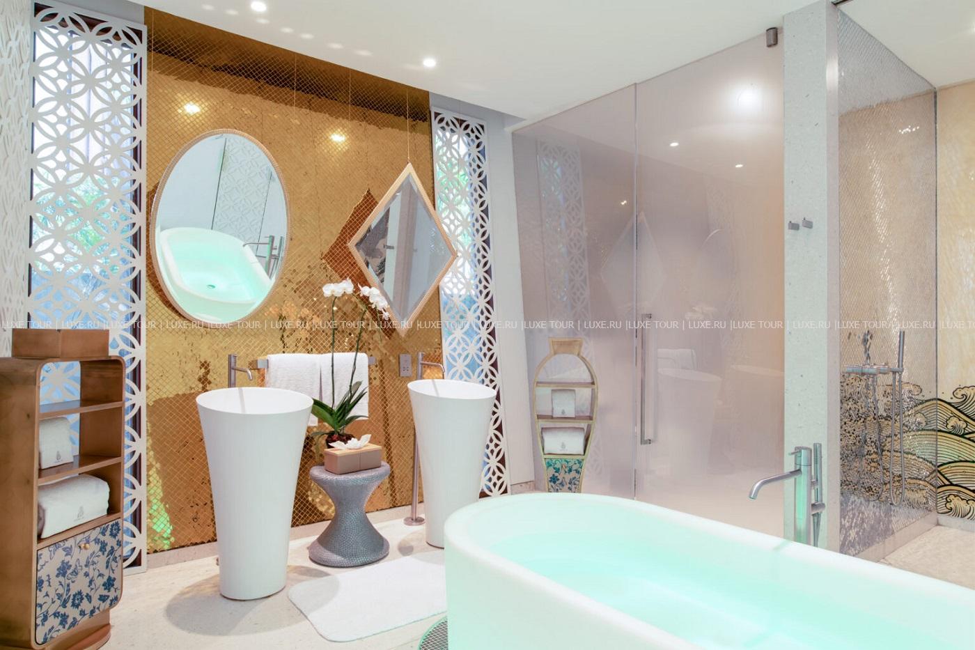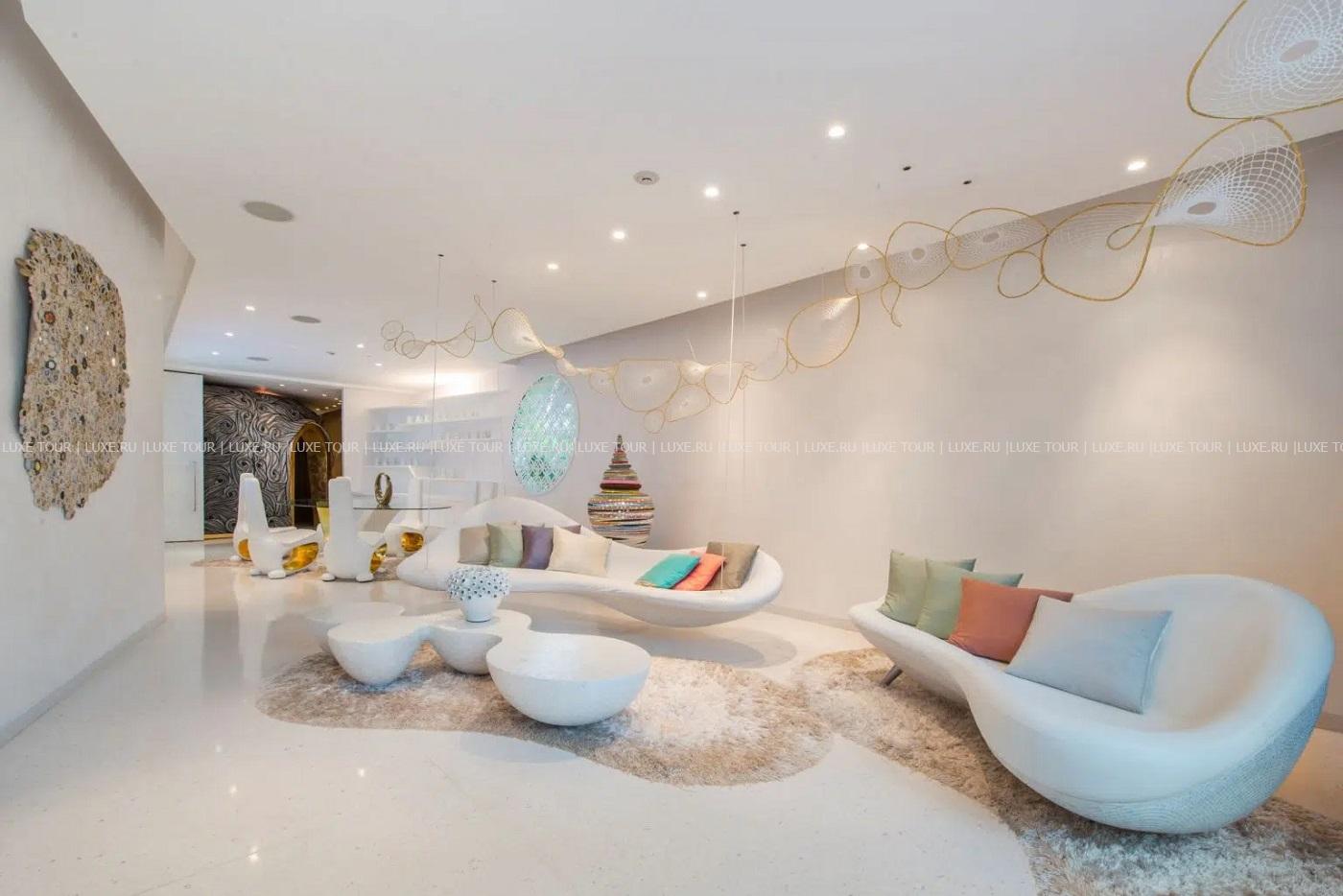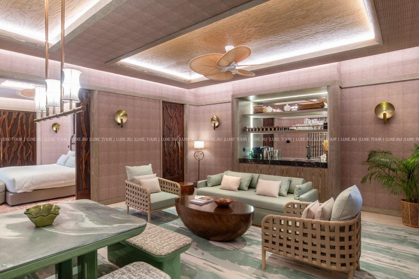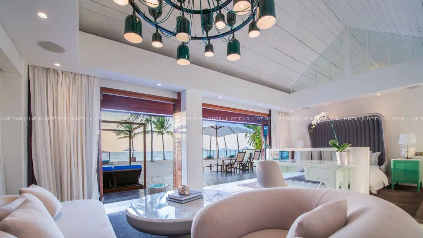 548 м2. Состоит из трех спален с кроватями king-size, гостиной, гардеробной, ванной комнаты, комнаты для спа-процедур, мебелированной террасы с бассейном и выходом на пляж. Максимальное размещение — 6 человек.