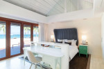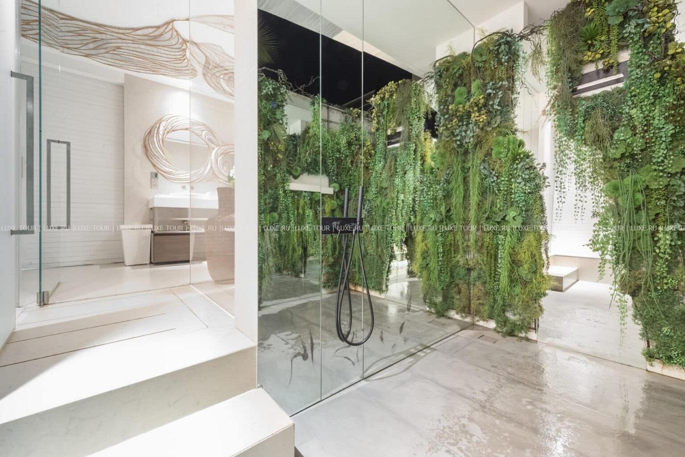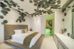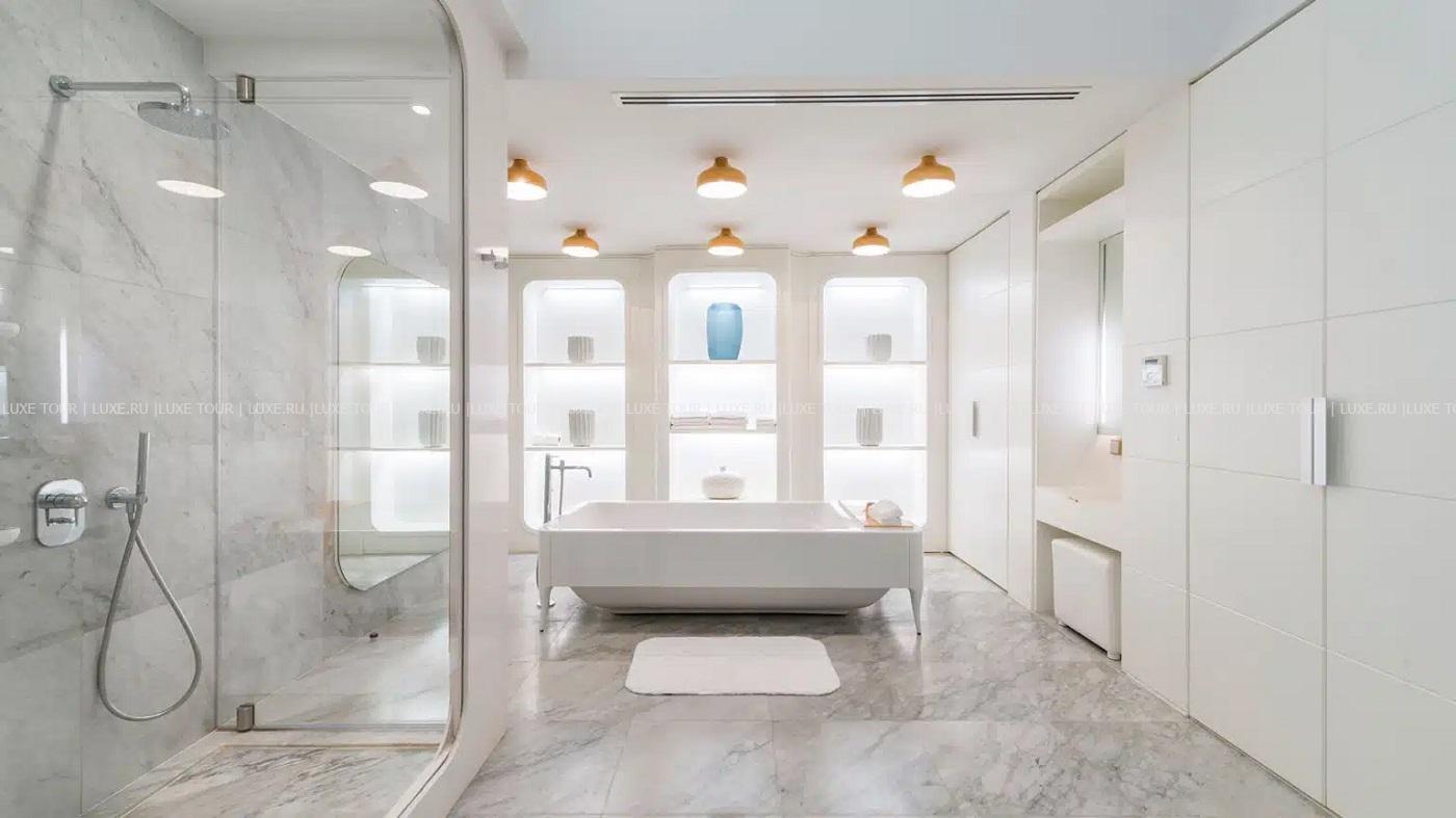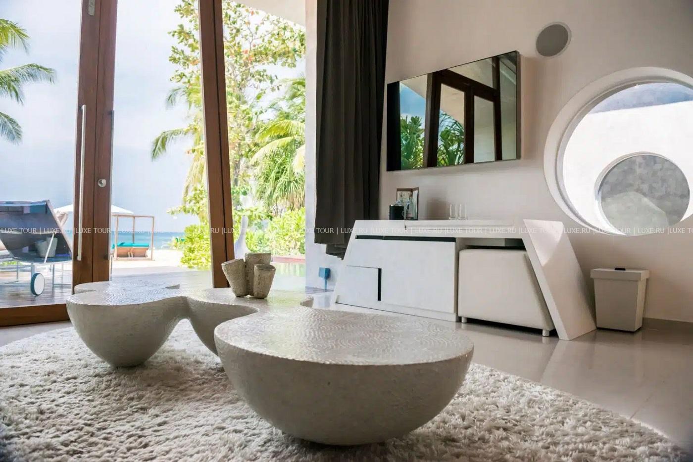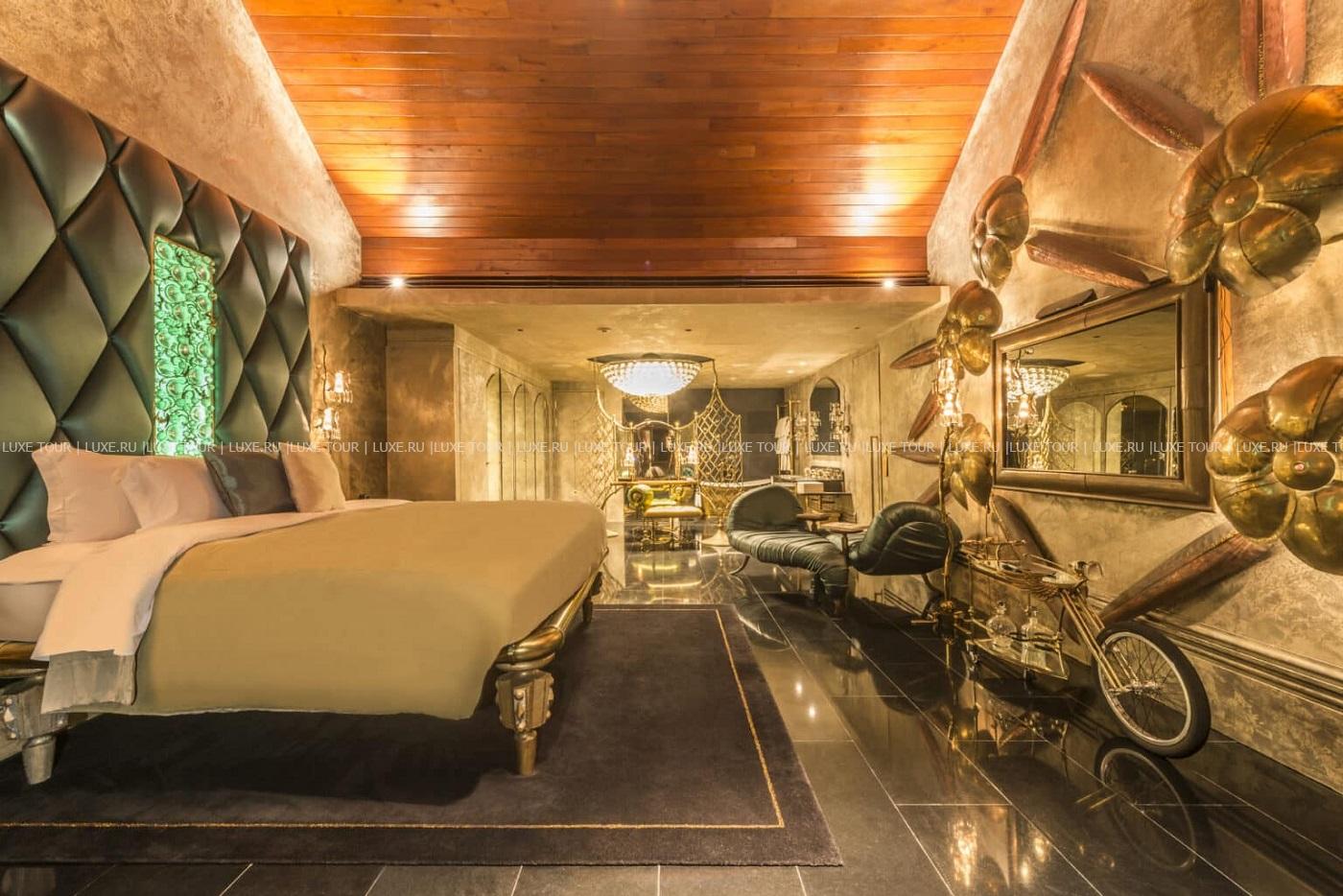 548 м2. Состоит из трех спален с кроватями king-size, гостиной, гардеробной, ванной комнаты, комнаты для спа-процедур, мебелированной террасы с бассейном и выходом на пляж. Максимальное размещение — 6 человек.