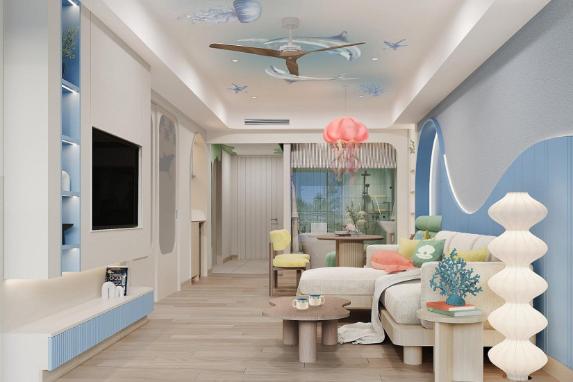 - 90 м2. Состоит из двух спален с кроватью king-size или кроватями twin, выдвижной кровати и двухъярусной кровати, гостиной с обеденной зоной, ванных комнат, террасы с выходом к бассейну.