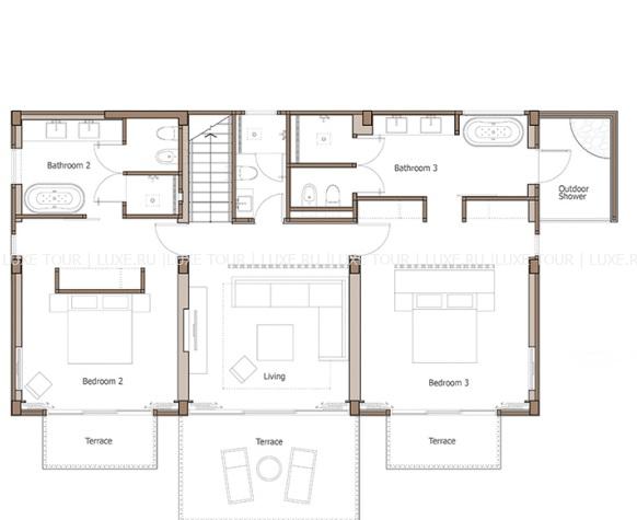 458 м2. Двухэтажная вилла, состоит из трех спален с двумя кроватями king-size и двумя кроватями twin, ванных комнат, гостиных с обеденной зоной, кухни, меблированной террасы, бассейна. Вид на море. Максимальное размещение – 8 человек.