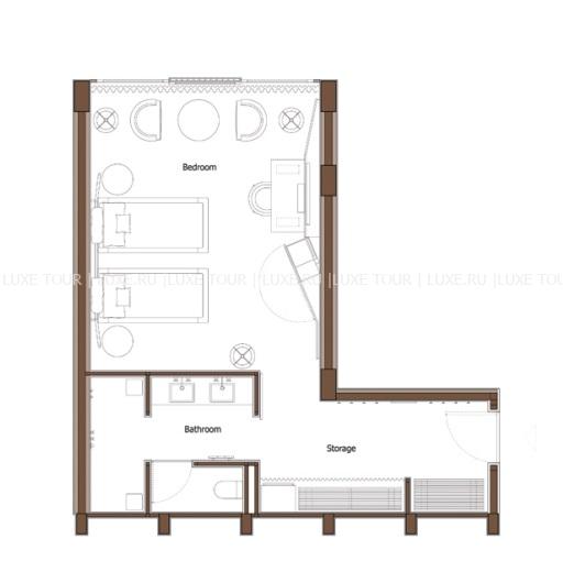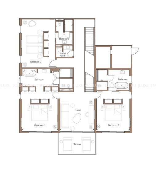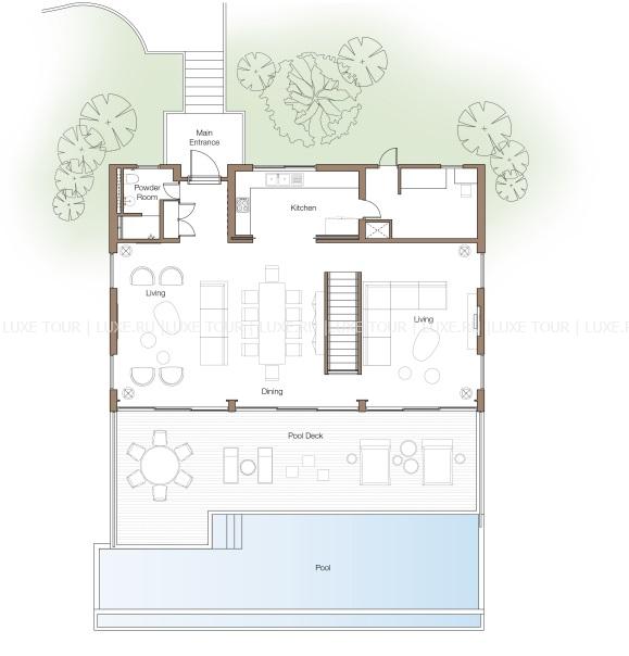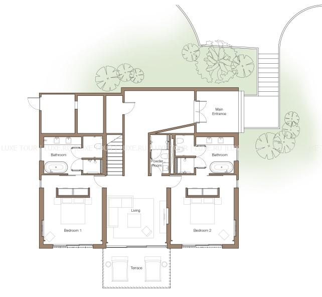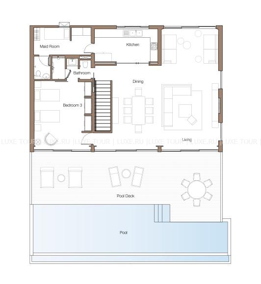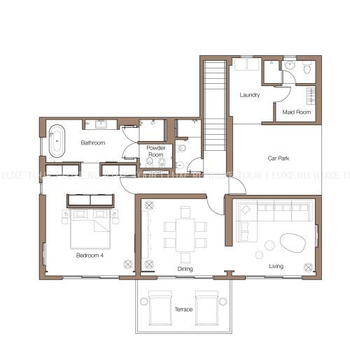 226 м2. Состоит из двух спален с кроватью king-size и двумя кроватями twin, ванных комнат, гостиной с обеденной зоной, гардеробной, меблированной террасы, бассейна. Максимальное размещение – 4 человека.