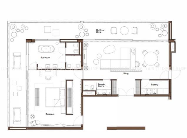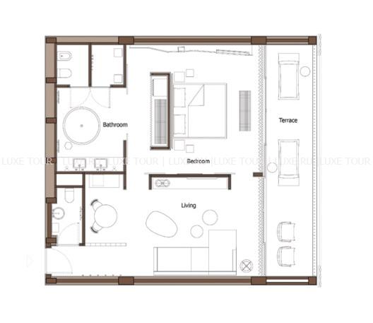 97 м2. Состоит из спальни с кроватью king-size, зоны отдыха, ванной комнаты, меблированной террассы с бассейном. Вид на море. Максимальное размещение – 2 человека.