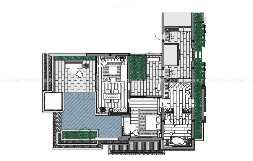 796 м2. Состоит из двух спален с кроватью размера king-size и двумя кроватями twin, гостиной, столовой, двух ванных комнат, меблированной террасы с бассейном. Вид на море. Расположен на пляже. Максимальное размещение — 4 человека.