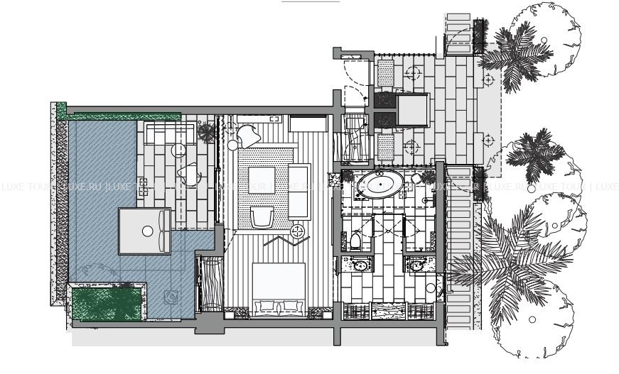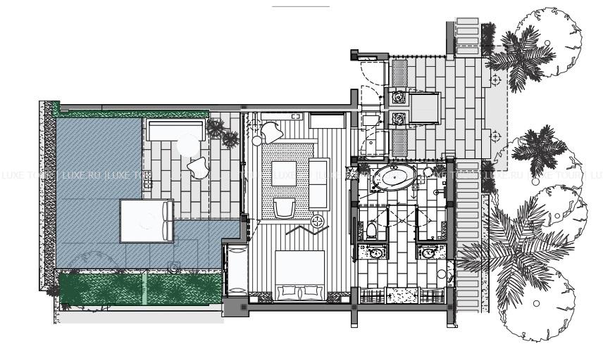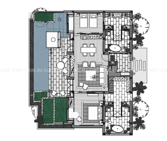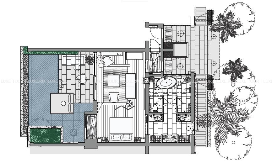 130 м2. Состоит из спальни с кроватью king-size или двумя кроватями twin, гостиной зоны, ванной комнаты, душа на открытом воздухе, меблированной террасы с бассейном. Вид на сады. Максимальное размещение — 3 человека.