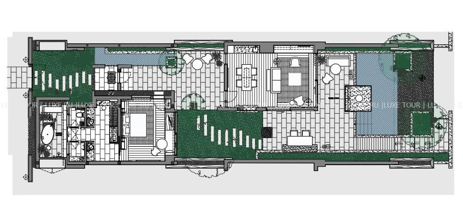 146 м2. Состоит из спальни с кроватью king-size, гостиной зоны, ванной комнаты, душа на открытом воздухе, меблированной террасы с бассейном. Вид на лагуну. Расположен на берегу лагуны. Максимальное размещение — 3 человека.